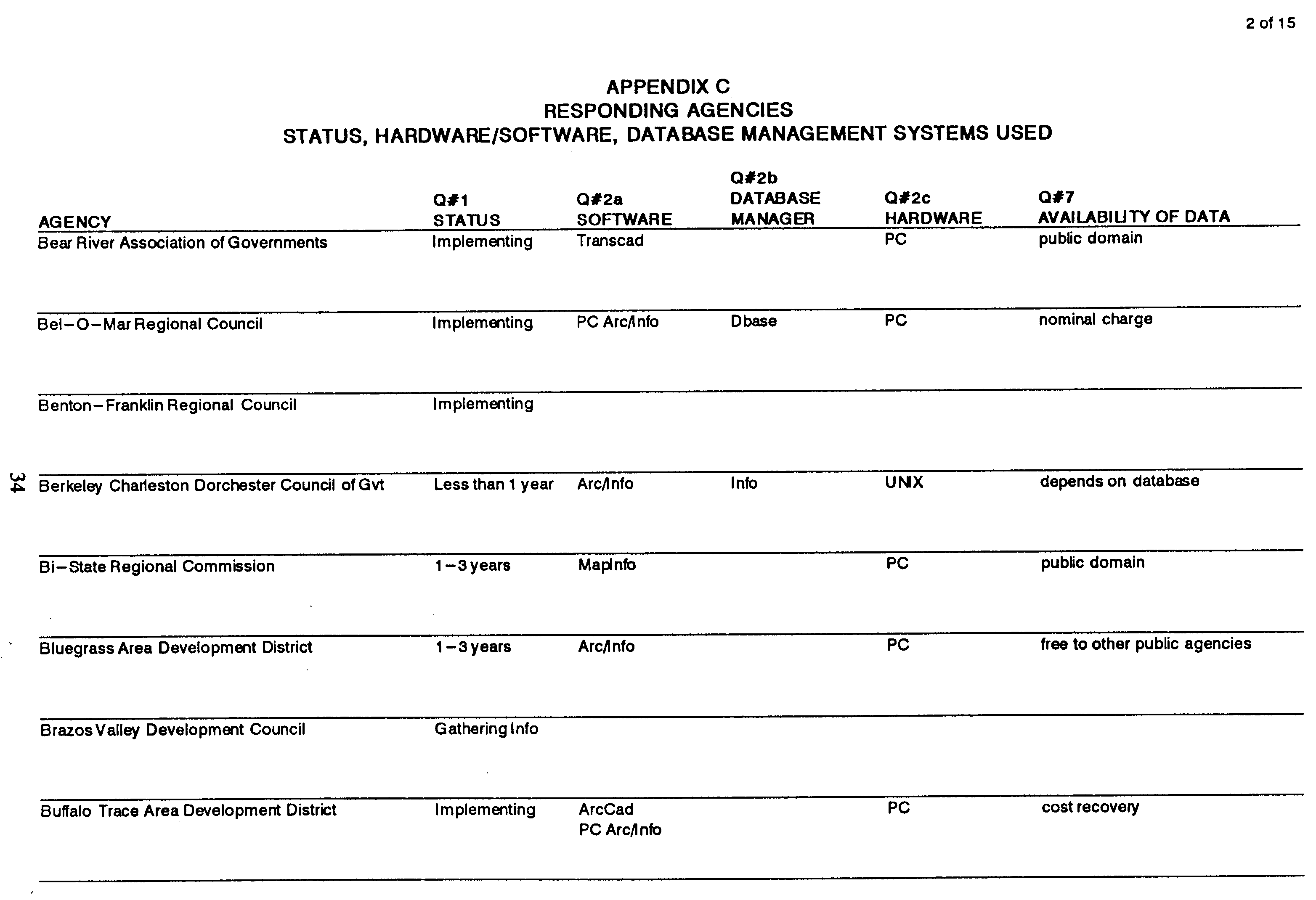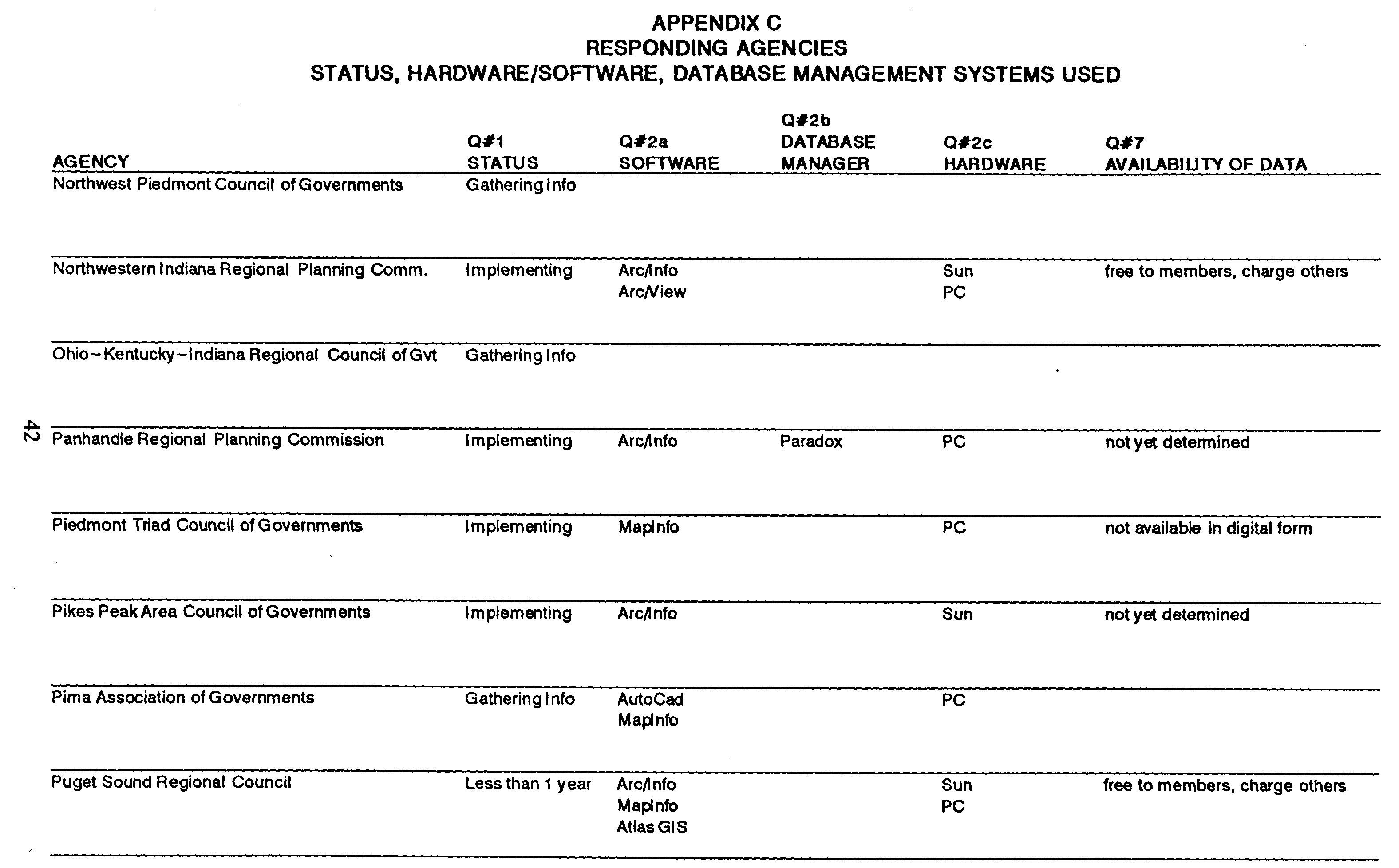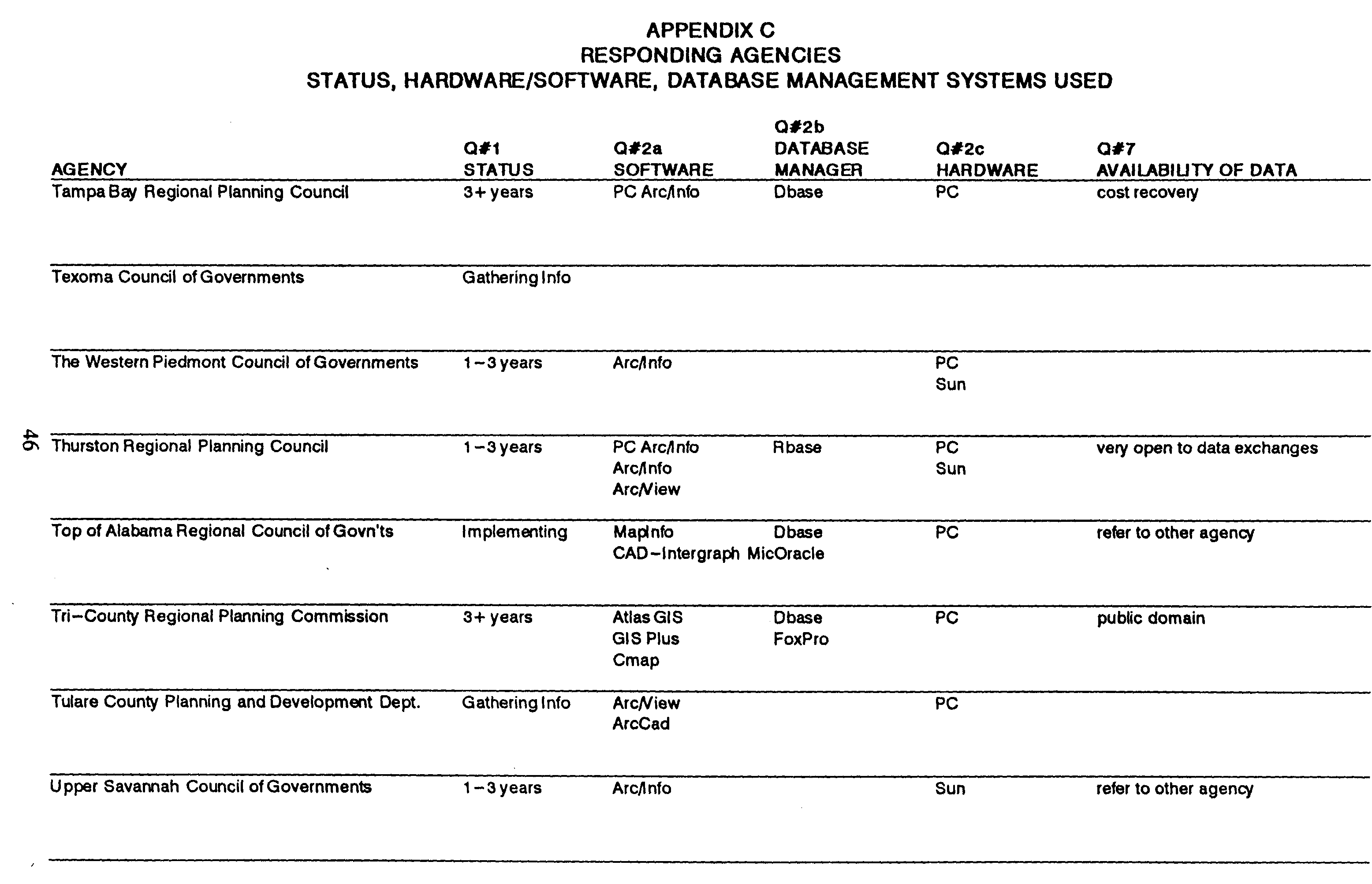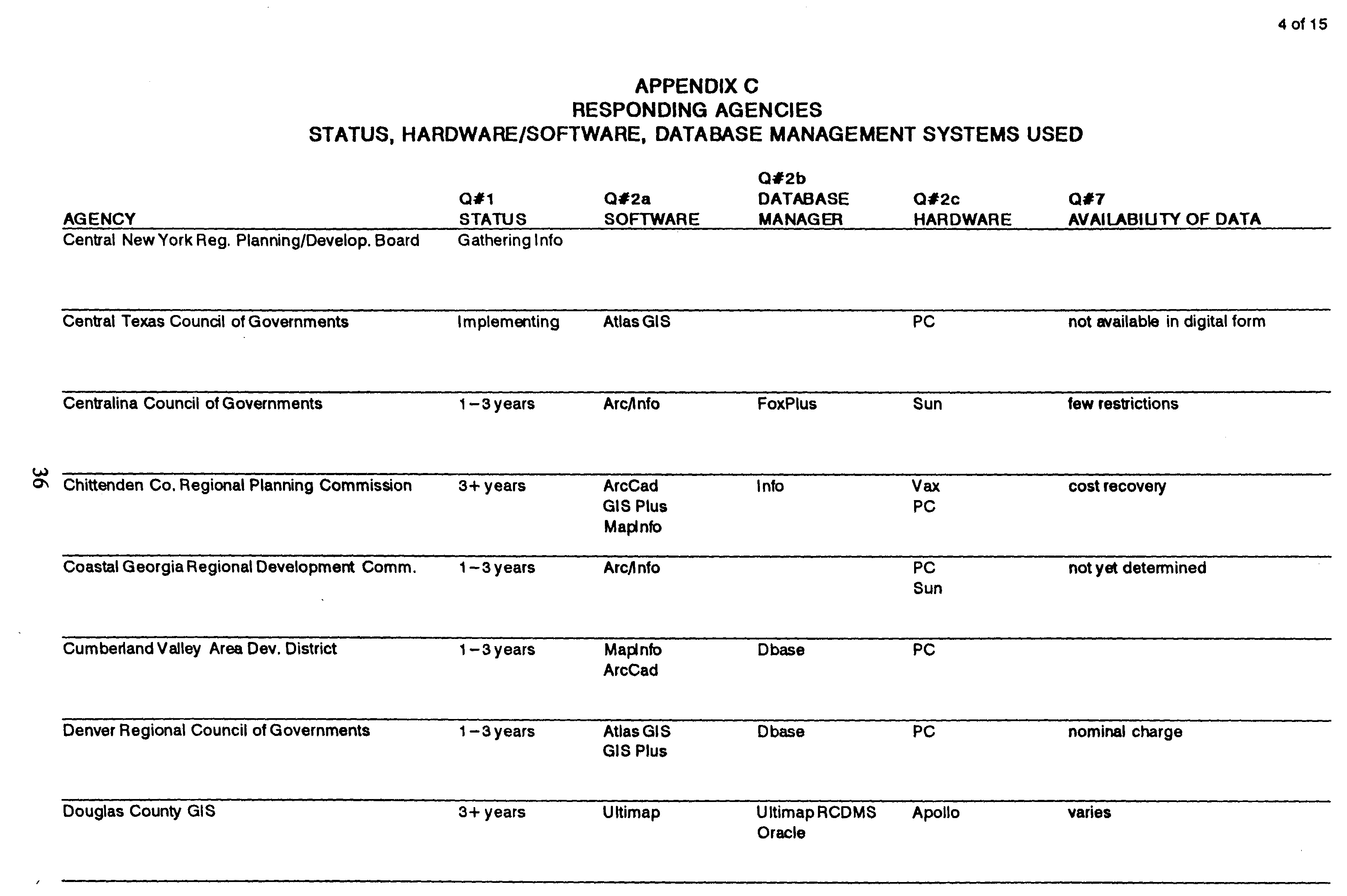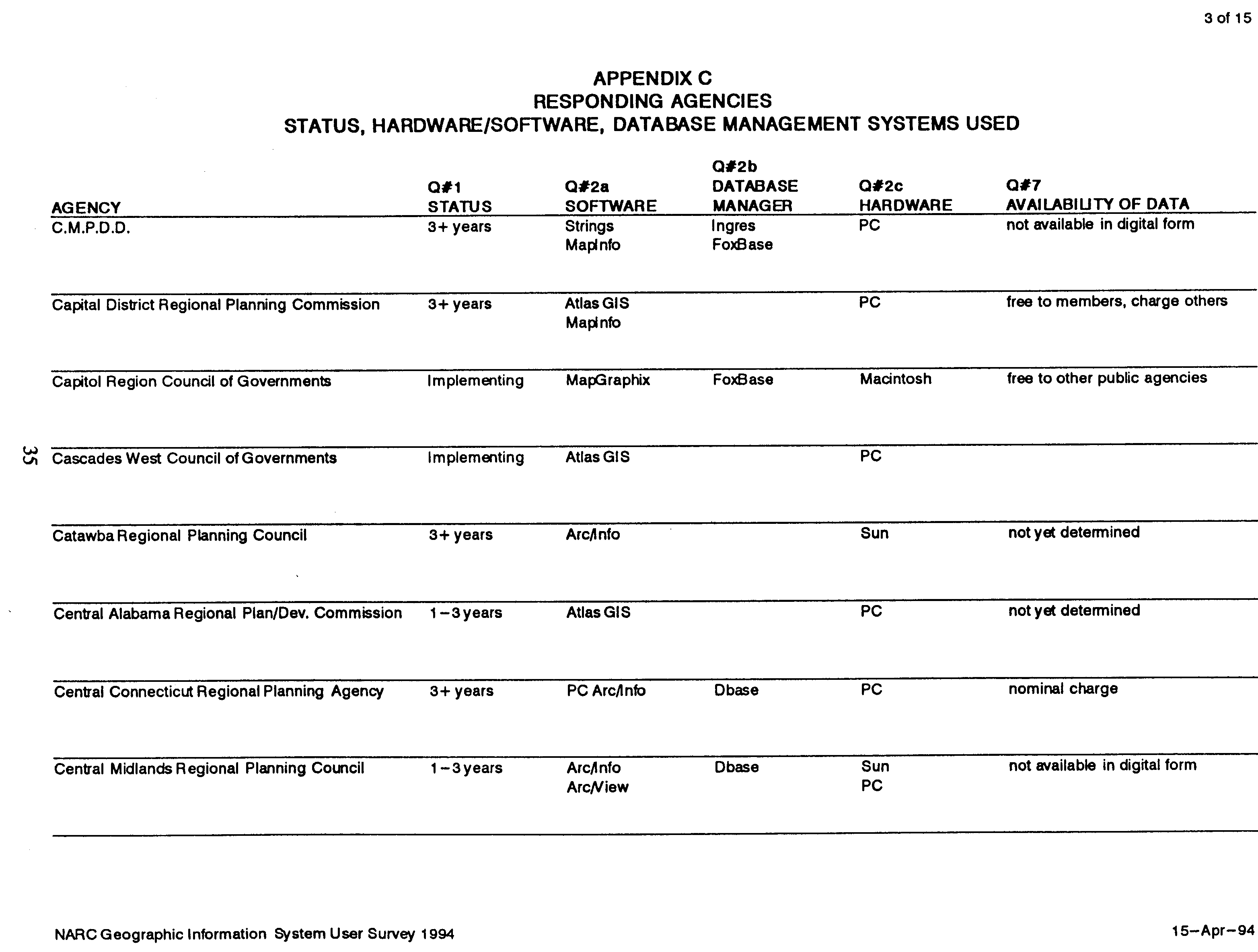 Click HERE for graphic. TABLE OF CONTENTS INTRODUCTION . . . . . . . . . . . . . . . . . . . . . . . . . . . . 3 RESPONSE RATE. . . . . . . . . . . . . . . . . . . . . . . . . . . . 3 STATUS OF GIS USE (QUESTION 1) . . . . . . . . . . . . . . . . . . . 3 SOFTWARE/HARDWARE (QUESTION 2) . . . . . . . . . . . . . . . . . . . 5 DIGITAL DATA BASES (QUESTION 3). . . . . . . . . . . . . . . . . . . 7 GEOGRAPHIC REFERENCE SYSTEM (QUESTION 4) . . . . . . . . . . . . . . 9 FORMAL STANDARDS AND DATA DICTIONARIES (QUESTIONS 5 AND 6). . . . . . . . . . . . . . . . . . . . . . . . . 9 AVAILABILITY OF DATA BASES TO OTHER AGENCIES (QUESTION 7) . . . . . . . . . . . . . . . . . . . . . . . . . . . .10 APPENDICES: A: SURVEY QUESTIONNAIRE . . . . . . . . . . . . . . . . . . . .15 B: RESPONDING AGENCIES - GIS CONTACTS . . . . . . . . . . . . .21 C: RESPONDING AGENCIES - STATUS, HARDWARE/ SOFTWARE, DATABASE MANAGEMENT SYSTEMS USED . . . . . . . . .33 D: RESPONDING AGENCIES - GIS DATABASES. . . . . . . . . . . . .51 iii LIST OF TABLES Table 1 Status of GIS at Councils of Goverment . . . . . . . . . . 4 Table 2 Types of GIS Packages Used . . . . . . . . . . . . . . . . 5 Table 3 Data Base Manager Software Used With GIS . . . . . . . . . 6 Table 4 Types of Hardware Used for GIS . . . . . . . . . . . . . . 7 Table 5 Types of Data Bases Used or Maintained . . . . . . . . . . 8 Table 6 Locational Accuracy of Data Bases. . . . . . . . . . . . . 9 Table 7 Availability of Digital Data . . . . . . . . . . . . . . .10 v SUMMARY OF THE 1994 NARC GEOGRAPHIC INFORMATION SYSTEM (GIS) USER SURVEY SUMMARY OF THE 1994 NARC GEOGRAPHIC INFORMATION SYSTEM (GIS) USER SURVEY INTRODUCTION In January, a Geographic Information System (GIS) User Survey was sent to 182 councils of governinent (COGs) on the National Association of Regional Councils' (NARC) mailing list. In subsequent months, two follow-up mailings were made to non-responding agencies. The survey was an initial effort by NARC's GIS Technical Network to get a better understanding of the use of GIS by COGs, and the types of data bases being used and maintained. The survey was not intended to provide a complete description of each agency's GIS and their applications, but was intentionally kept short to obtain a higher response rate and to provide a general overview of GIS use by councils of government. A copy of the survey instrument can be found in Appendix A. RESPONSE RATE Following the initial January mailout of the survey to the 182 agencies, a total of 43 or 23.6 percent responded. A second mailing was sent to non-responding agencies in February, increasing the response rate to 53.2 percent (97 agencies). As part of NARC's effort to establish a GIS Technical Network, a third mailing to non- responding agencies was made in early March. This final mailing yielded an additional 18 responses, for a total of 114 agencies responding to the survey, or a response rate of 62.6 percent. A list of the responding agencies, with a GIS contact person's name and address, is contained in Appendix B. STATUS OF GIS USE (QUESTION 1) Almost 60 percent of the COGs responding have had a GIS in operation for more than one year, while over one-fifth of the COGs have had a GIS in operation for more than three years. Sixteen agencies (14 percent) responded that they were gathering information about GIS. Table I provides a breakdown of responses to Question 1: "Which of the following best describes your agency regarding the use of a GIS?" 3 Table I STATUS OF GIS AT COUNCILS OF GOVERNMENT # of % of Agencies Total Our functions don't require GIS 0 0% Haven't considered the need for a GIS 0 0% Gathering information about GIS 16 14% Currently implementing a GIS 23 20% Have had a GIS in operation less than 1 year 7 6% Have had a GIS in operation 1 to 3 years 43 38% Have had a GIS in operation for more than 3 years 25 22% TOTAL 114 100% 4 SOFTWARE/HARDWARE (QUESTION 2) Ninety-six agencies indicated that they used at least one GIS software package. Forty-four agencies listed two or more packages. A total of 17 different packages were listed as in use. The top three software packages listed were: Arc/Info - PC Arc/Info (55 users), Atlas GIS (25 users), and MapInfo (18 users). Table 2 provides a breakdown of the number of users for each package. Table 2 TYPES OF GIS PACKAGES USED # of Agencies % of Agencies Using Software Responding ArcCad 7 7% Arc/Info 36 37% PC Arc/Info 19 20% ArcView 12 12% Atlas GIS 25 26% AutoCad 3 3% CAD - Intergraph 1 1% CMap 3 3% Erdas 2 2% Geo/SQL - Generation 5 1 1% GIS Plus 6 6% MapGraphix 2 2% MapInfo 18 19% Strings 1 1% Transcad 2 2% Unisys 1 1% Ultimap 1 1% TOTAL 140* 144%* *A total of 96 agencies responded, with some agencies using more than one package. 5 Fifty-eight agencies indicated that they were using at least one Relational Data Base Management System (RDBMS) package in conjunction with their GIS. Eleven agencies listed two RDBMSs. A total of 17 different RDBMS packages were listed, with various versions of DBase listed by the most agencies (29 users). Table 3 provides a breakdown of the number of users for each package. Table 3 DATA BASE MANAGER SOFTWARE USED WITH GIS # of Agencies % of Agencies Using Software Responding Access 1 2% Alpha4 2 3% DBase 29 50% Empress 1 2% Excel 1 2% FilePro 1 2% FoxBase 3 5% FoxPlus 2 3% FoxPro 4 7% Info 8 14% Ingres 3 5% Oracle 4 7% Paradox 6 10% RBase 1 2% SAS 1 2% Sybase 1 2% Ultimap RCDMS 1 2% TOTAL 69* 120%* *A total of 58 agencies responded, with some agencies using more than one package. 6 Ten different general categories of hardware platforms were listed by 95 agencies responding. Twenty-three agencies listed two different platforms. PCs were listed the most often (75 users), followed by SUN workstations (27 users). Table 4 provides a breakdown of listed hardware platforms. Table 4 TYPES OF HARDWARE USED FOR GIS # of Agencies # of Agencies Using Hardware Responding Apollo 1 1% Apple 1 1% Data General 1 1% HP 700 Series 5 5% I