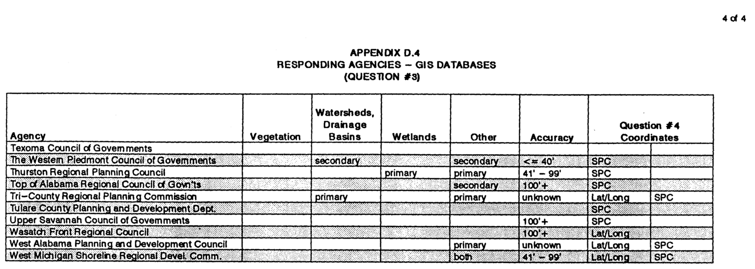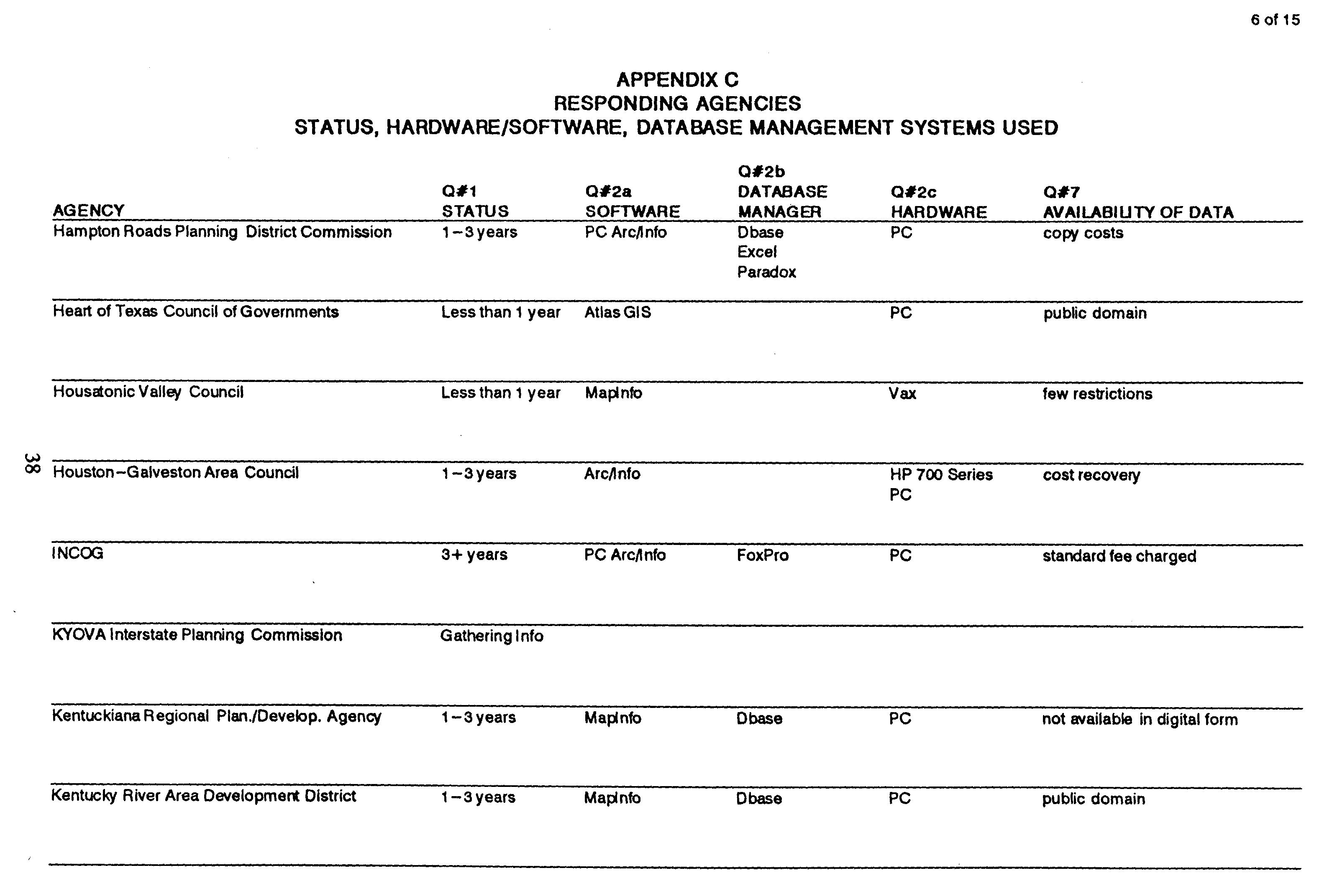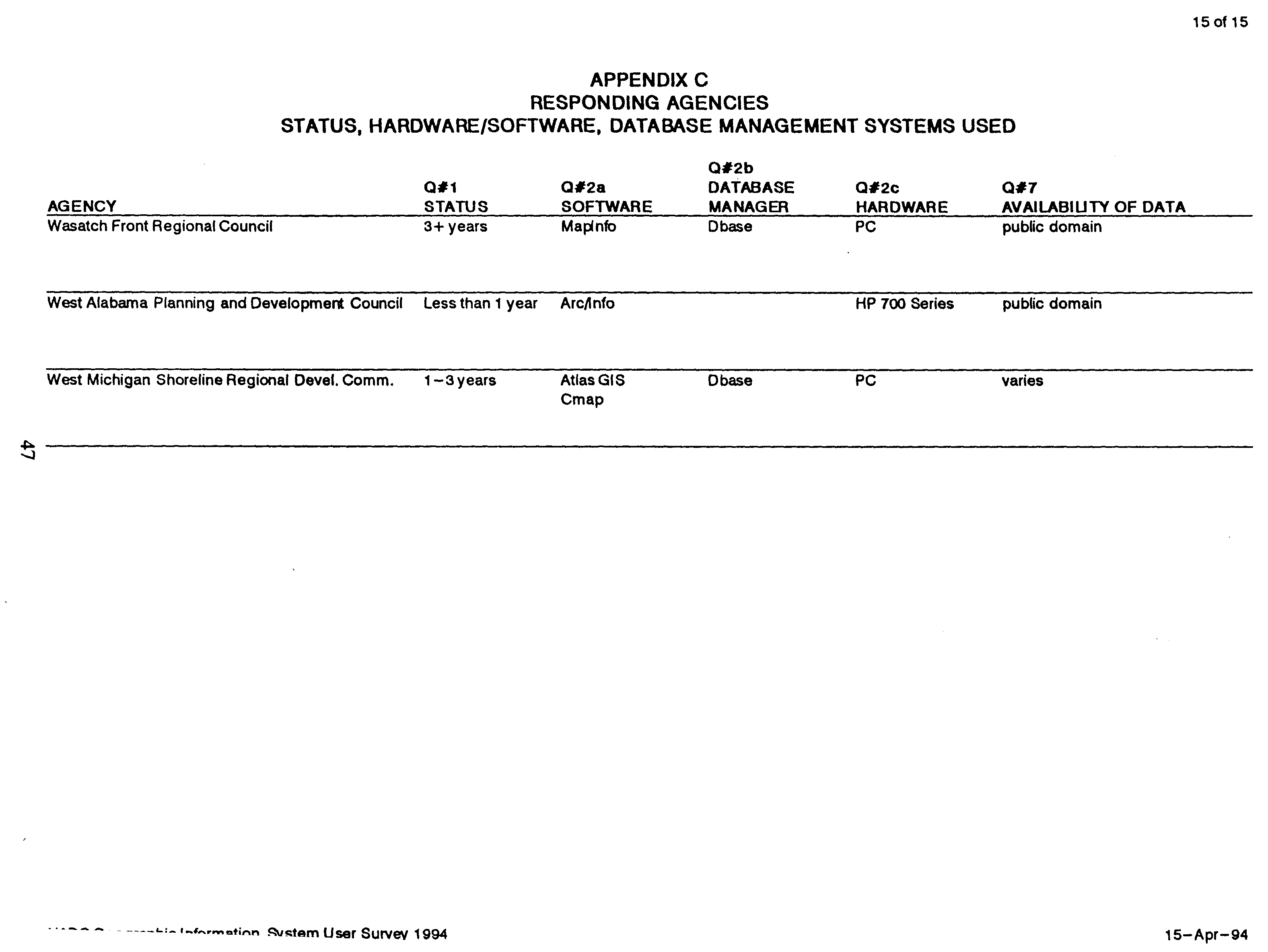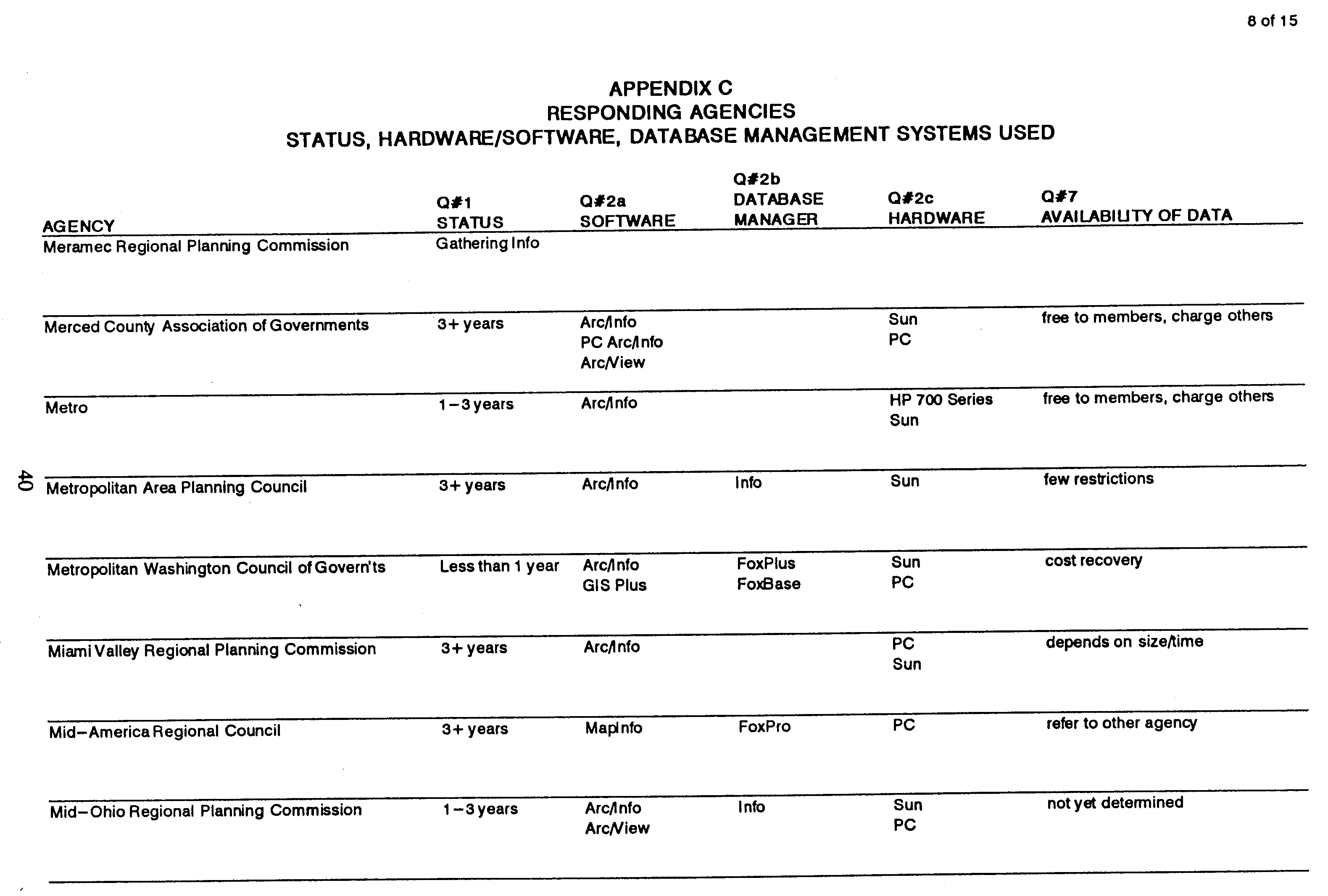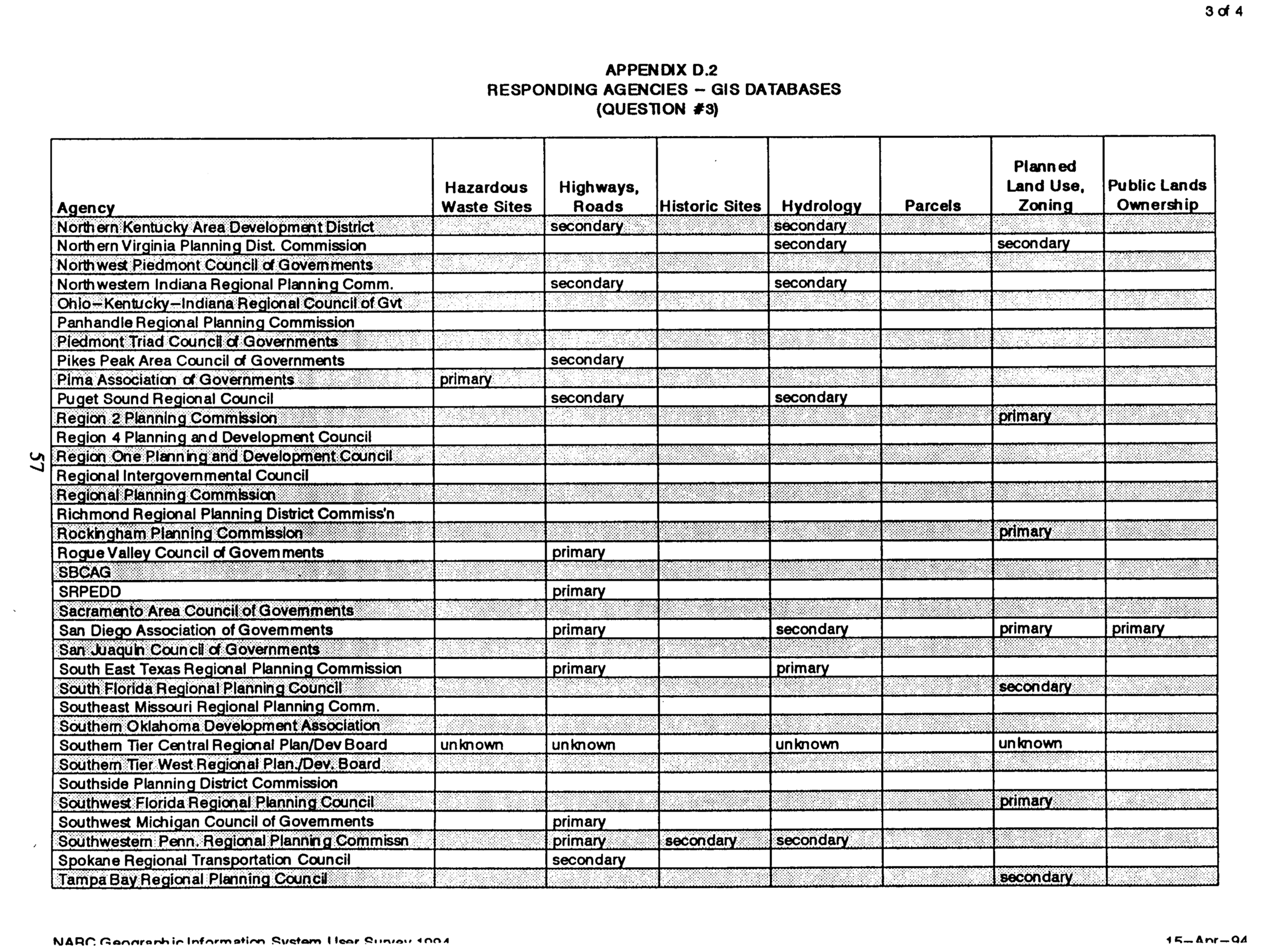 Click HERE for graphic. TABLE OF CONTENTS INTRODUCTION . . . . . . . . . . . . . . . . . . . . . . . . . . . . 3 RESPONSE RATE. . . . . . . . . . . . . . . . . . . . . . . . . . . . 3 STATUS OF GIS USE (QUESTION 1) . . . . . . . . . . . . . . . . . . . 3 SOFTWARE/HARDWARE (QUESTION 2) . . . . . . . . . . . . . . . . . . . 5 DIGITAL DATA BASES (QUESTION 3). . . . . . . . . . . . . . . . . . . 7 GEOGRAPHIC REFERENCE SYSTEM (QUESTION 4) . . . . . . . . . . . . . . 9 FORMAL STANDARDS AND DATA DICTIONARIES (QUESTIONS 5 AND 6). . . . . . . . . . . . . . . . . . . . . . . . . 9 AVAILABILITY OF DATA BASES TO OTHER AGENCIES (QUESTION 7) . . . . . . . . . . . . . . . . . . . . . . . . . . . .10 APPENDICES: A: SURVEY QUESTIONNAIRE . . . . . . . . . . . . . . . . . . . .15 B: RESPONDING AGENCIES - GIS CONTACTS . . . . . . . . . . . . .21 C: RESPONDING AGENCIES - STATUS, HARDWARE/ SOFTWARE, DATABASE MANAGEMENT SYSTEMS USED . . . . . . . . .33 D: RESPONDING AGENCIES - GIS DATABASES. . . . . . . . . . . . .51 iii LIST OF TABLES Table 1 Status of GIS at Councils of Goverment . . . . . . . . . . 4 Table 2 Types of GIS Packages Used . . . . . . . . . . . . . . . . 5 Table 3 Data Base Manager Software Used With GIS . . . . . . . . . 6 Table 4 Types of Hardware Used for GIS . . . . . . . . . . . . . . 7 Table 5 Types of Data Bases Used or Maintained . . . . . . . . . . 8 Table 6 Locational Accuracy of Data Bases. . . . . . . . . . . . . 9 Table 7 Availability of Digital Data . . . . . . . . . . . . . . .10 v SUMMARY OF THE 1994 NARC GEOGRAPHIC INFORMATION SYSTEM (GIS) USER SURVEY SUMMARY OF THE 1994 NARC GEOGRAPHIC INFORMATION SYSTEM (GIS) USER SURVEY INTRODUCTION In January, a Geographic Information System (GIS) User Survey was sent to 182 councils of governinent (COGs) on the National Association of Regional Councils' (NARC) mailing list. In subsequent months, two follow-up mailings were made to non-responding agencies. The survey was an initial effort by NARC's GIS Technical Network to get a better understanding of the use of GIS by COGs, and the types of data bases being used and maintained. The survey was not intended to provide a complete description of each agency's GIS and their applications, but was intentionally kept short to obtain a higher response rate and to provide a general overview of GIS use by councils of government. A copy of the survey instrument can be found in Appendix A. RESPONSE RATE Following the initial January mailout of the survey to the 182 agencies, a total of 43 or 23.6 percent responded. A second mailing was sent to non-responding agencies in February, increasing the response rate to 53.2 percent (97 agencies). As part of NARC's effort to establish a GIS Technical Network, a third mailing to non- responding agencies was made in early March. This final mailing yielded an additional 18 responses, for a total of 114 agencies responding to the survey, or a response rate of 62.6 percent. A list of the responding agencies, with a GIS contact person's name and address, is contained in Appendix B. STATUS OF GIS USE (QUESTION 1) Almost 60 percent of the COGs responding have had a GIS in operation for more than one year, while over one-fifth of the COGs have had a GIS in operation for more than three years. Sixteen agencies (14 percent) responded that they were gathering information about GIS. Table I provides a breakdown of responses to Question 1: "Which of the following best describes your agency regarding the use of a GIS?" 3 Table I STATUS OF GIS AT COUNCILS OF GOVERNMENT # of % of Agencies Total Our functions don't require GIS 0 0% Haven't considered the need for a GIS 0 0% Gathering information about GIS 16 14% Currently implementing a GIS 23 20% Have had a GIS in operation less than 1 year 7 6% Have had a GIS in operation 1 to 3 years 43 38% Have had a GIS in operation for more than 3 years 25 22% TOTAL 114 100% 4 SOFTWARE/HARDWARE (QUESTION 2) Ninety-six agencies indicated that they used at least one GIS software package. Forty-four agencies listed two or more packages. A total of 17 different packages were listed as in use. The top three software packages listed were: Arc/Info - PC Arc/Info (55 users), Atlas GIS (25 users), and MapInfo (18 users). Table 2 provides a breakdown of the number of users for each package. Table 2 TYPES OF GIS PACKAGES USED # of Agencies % of Agencies Using Software Responding ArcCad 7 7% Arc/Info 36 37% PC Arc/Info 19 20% ArcView 12 12% Atlas GIS 25 26% AutoCad 3 3% CAD - Intergraph 1 1% CMap 3 3% Erdas 2 2% Geo/SQL - Generation 5 1 1% GIS Plus 6 6% MapGraphix 2 2% MapInfo 18 19% Strings 1 1% Transcad 2 2% Unisys 1 1% Ultimap 1 1% TOTAL 140* 144%* *A total of 96 agencies responded, with some agencies using more than one package. 5 Fifty-eight agencies indicated that they were using at least one Relational Data Base Management System (RDBMS) package in conjunction with their GIS. Eleven agencies listed two RDBMSs. A total of 17 different RDBMS packages were listed, with various versions of DBase listed by the most agencies (29 users). Table 3 provides a breakdown of the number of users for each package. Table 3 DATA BASE MANAGER SOFTWARE USED WITH GIS # of Agencies % of Agencies Using Software Responding Access 1 2% Alpha4 2 3% DBase 29 50% Empress 1 2% Excel 1 2% FilePro 1 2% FoxBase 3 5% FoxPlus 2 3% FoxPro 4 7% Info 8 14% Ingres 3 5% Oracle 4 7% Paradox 6 10% RBase 1 2% SAS 1 2% Sybase 1 2% Ultimap RCDMS 1 2% TOTAL 69* 120%* *A total of 58 agencies responded, with some agencies using more than one package. 6 Ten different general categories of hardware platforms were listed by 95 agencies responding. Twenty-three agencies listed two different platforms. PCs were listed the most often (75 users), followed by SUN workstations (27 users). Table 4 provides a breakdown of listed hardware platforms. Table 4 TYPES OF HARDWARE USED FOR GIS # of Agencies # of Agencies Using Hardware Responding Apollo 1 1% Apple 1 1% Data General 1 1% HP 700 Series 5 5% I