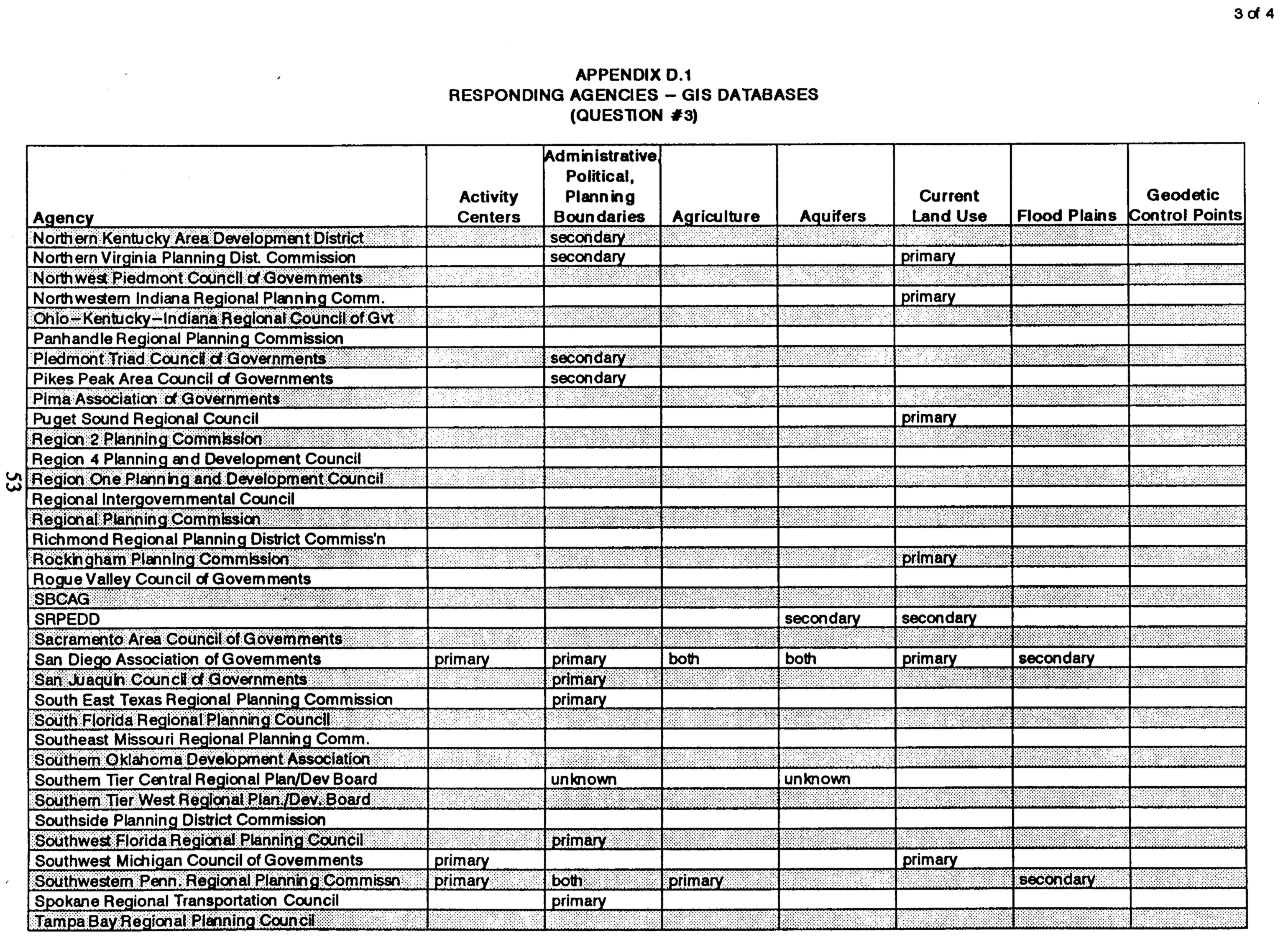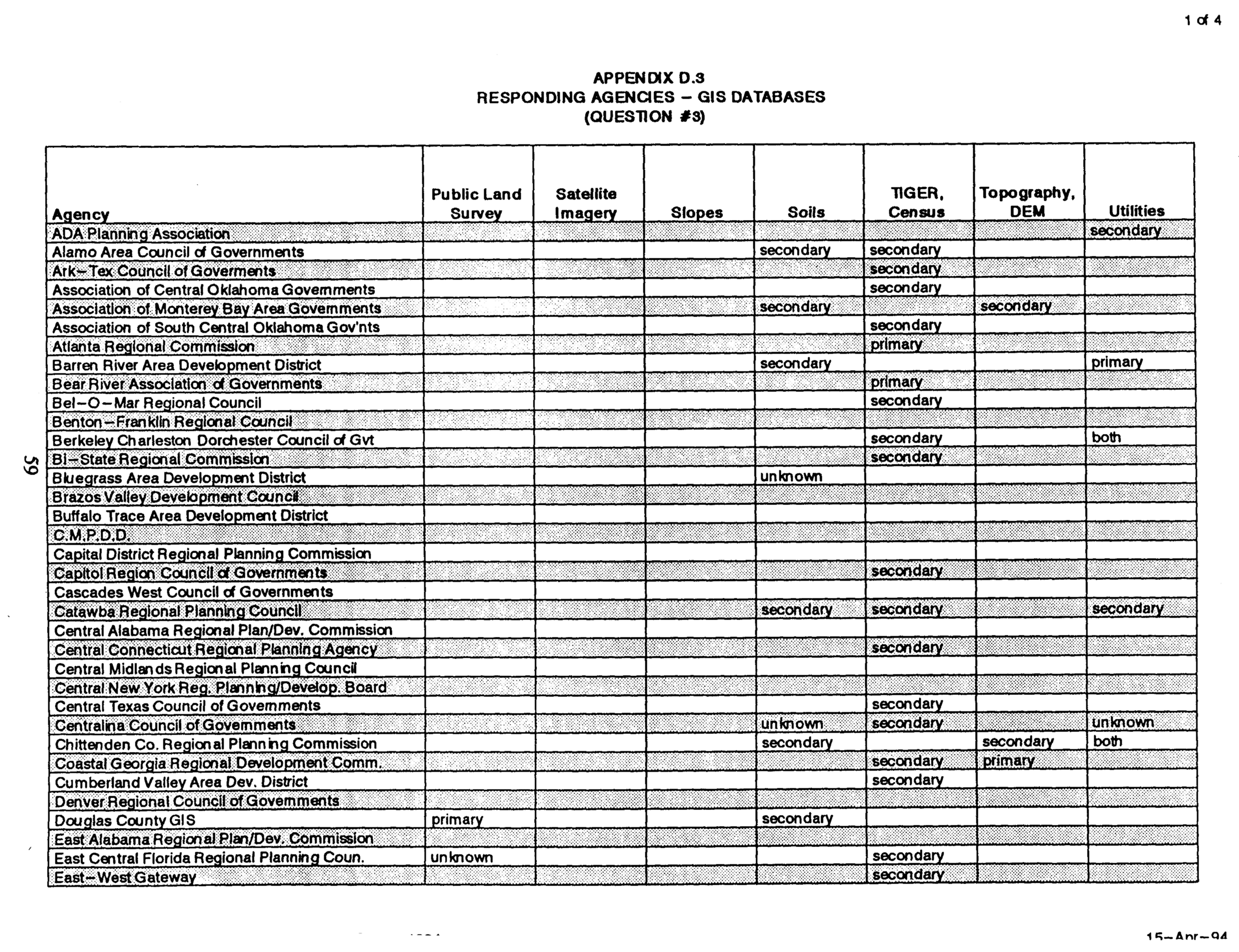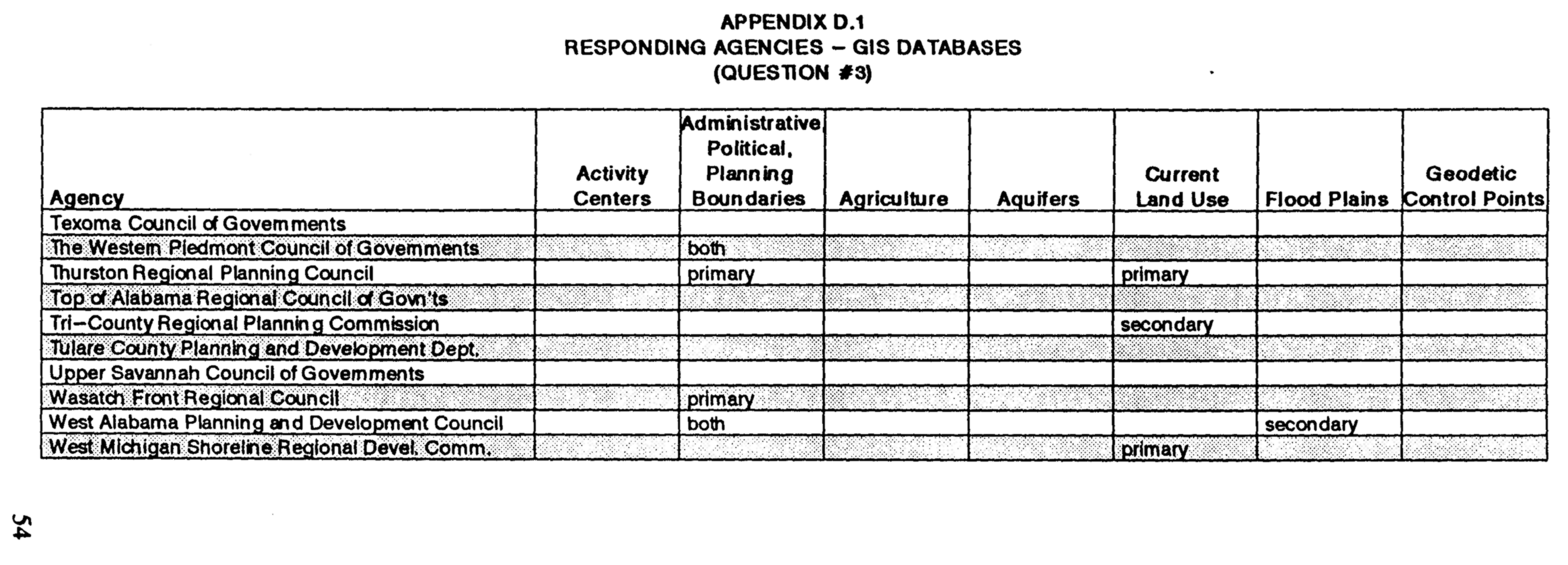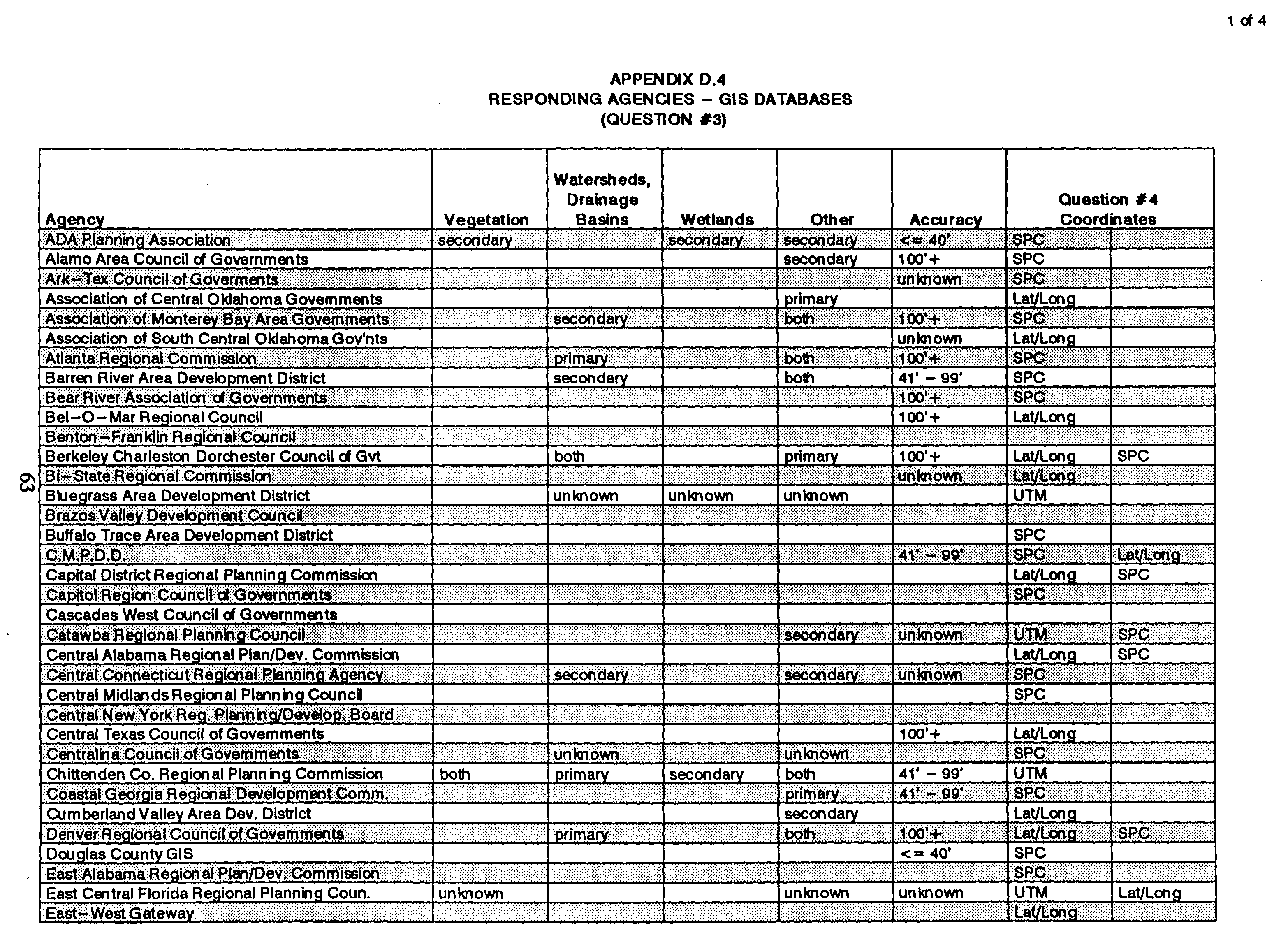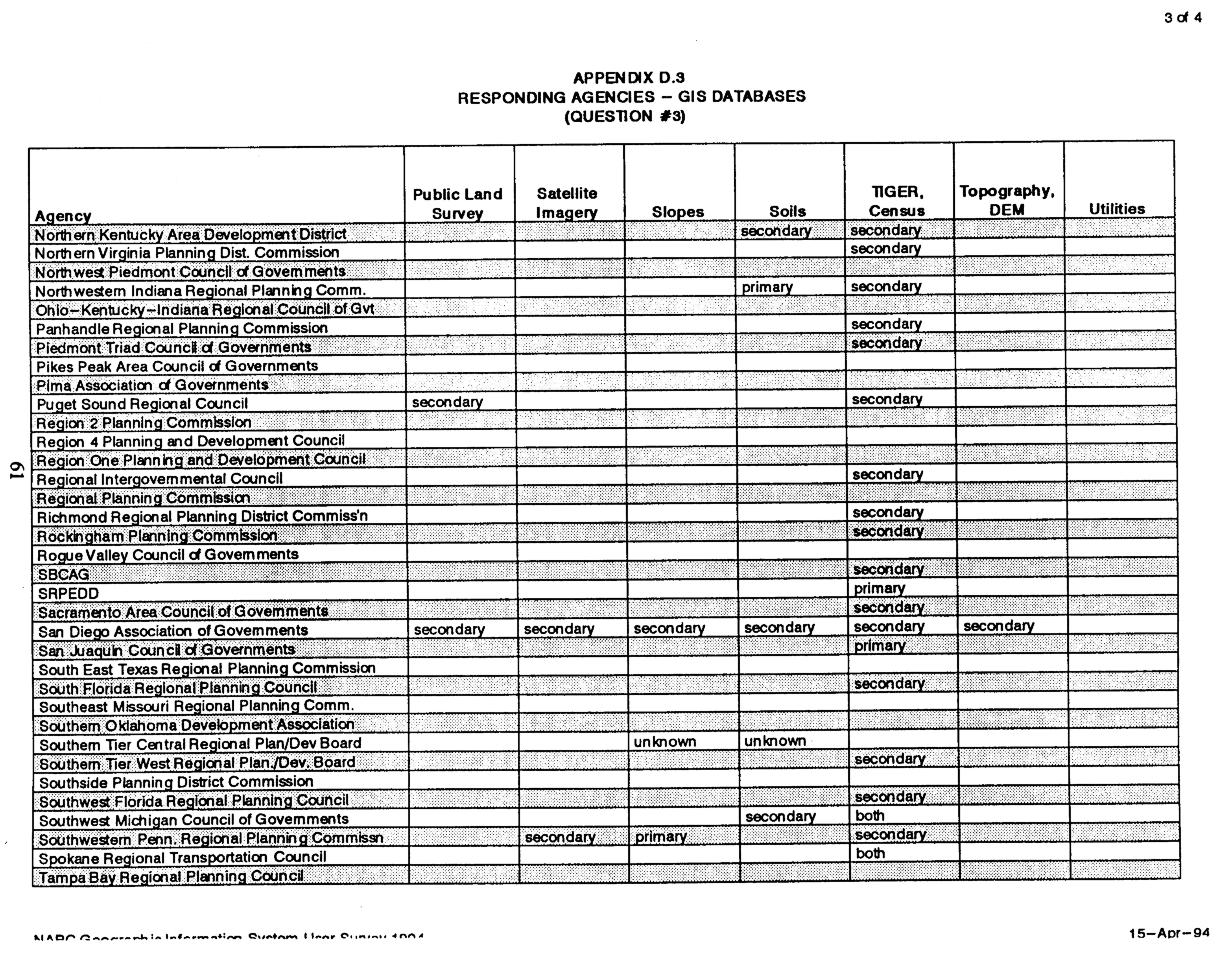 Click HERE for graphic. TABLE OF CONTENTS INTRODUCTION . . . . . . . . . . . . . . . . . . . . . . . . . . . . 3 RESPONSE RATE. . . . . . . . . . . . . . . . . . . . . . . . . . . . 3 STATUS OF GIS USE (QUESTION 1) . . . . . . . . . . . . . . . . . . . 3 SOFTWARE/HARDWARE (QUESTION 2) . . . . . . . . . . . . . . . . . . . 5 DIGITAL DATA BASES (QUESTION 3). . . . . . . . . . . . . . . . . . . 7 GEOGRAPHIC REFERENCE SYSTEM (QUESTION 4) . . . . . . . . . . . . . . 9 FORMAL STANDARDS AND DATA DICTIONARIES (QUESTIONS 5 AND 6). . . . . . . . . . . . . . . . . . . . . . . . . 9 AVAILABILITY OF DATA BASES TO OTHER AGENCIES (QUESTION 7) . . . . . . . . . . . . . . . . . . . . . . . . . . . .10 APPENDICES: A: SURVEY QUESTIONNAIRE . . . . . . . . . . . . . . . . . . . .15 B: RESPONDING AGENCIES - GIS CONTACTS . . . . . . . . . . . . .21 C: RESPONDING AGENCIES - STATUS, HARDWARE/ SOFTWARE, DATABASE MANAGEMENT SYSTEMS USED . . . . . . . . .33 D: RESPONDING AGENCIES - GIS DATABASES. . . . . . . . . . . . .51 iii LIST OF TABLES Table 1 Status of GIS at Councils of Goverment . . . . . . . . . . 4 Table 2 Types of GIS Packages Used . . . . . . . . . . . . . . . . 5 Table 3 Data Base Manager Software Used With GIS . . . . . . . . . 6 Table 4 Types of Hardware Used for GIS . . . . . . . . . . . . . . 7 Table 5 Types of Data Bases Used or Maintained . . . . . . . . . . 8 Table 6 Locational Accuracy of Data Bases. . . . . . . . . . . . . 9 Table 7 Availability of Digital Data . . . . . . . . . . . . . . .10 v SUMMARY OF THE 1994 NARC GEOGRAPHIC INFORMATION SYSTEM (GIS) USER SURVEY SUMMARY OF THE 1994 NARC GEOGRAPHIC INFORMATION SYSTEM (GIS) USER SURVEY INTRODUCTION In January, a Geographic Information System (GIS) User Survey was sent to 182 councils of governinent (COGs) on the National Association of Regional Councils' (NARC) mailing list. In subsequent months, two follow-up mailings were made to non-responding agencies. The survey was an initial effort by NARC's GIS Technical Network to get a better understanding of the use of GIS by COGs, and the types of data bases being used and maintained. The survey was not intended to provide a complete description of each agency's GIS and their applications, but was intentionally kept short to obtain a higher response rate and to provide a general overview of GIS use by councils of government. A copy of the survey instrument can be found in Appendix A. RESPONSE RATE Following the initial January mailout of the survey to the 182 agencies, a total of 43 or 23.6 percent responded. A second mailing was sent to non-responding agencies in February, increasing the response rate to 53.2 percent (97 agencies). As part of NARC's effort to establish a GIS Technical Network, a third mailing to non- responding agencies was made in early March. This final mailing yielded an additional 18 responses, for a total of 114 agencies responding to the survey, or a response rate of 62.6 percent. A list of the responding agencies, with a GIS contact person's name and address, is contained in Appendix B. STATUS OF GIS USE (QUESTION 1) Almost 60 percent of the COGs responding have had a GIS in operation for more than one year, while over one-fifth of the COGs have had a GIS in operation for more than three years. Sixteen agencies (14 percent) responded that they were gathering information about GIS. Table I provides a breakdown of responses to Question 1: "Which of the following best describes your agency regarding the use of a GIS?" 3 Table I STATUS OF GIS AT COUNCILS OF GOVERNMENT # of % of Agencies Total Our functions don't require GIS 0 0% Haven't considered the need for a GIS 0 0% Gathering information about GIS 16 14% Currently implementing a GIS 23 20% Have had a GIS in operation less than 1 year 7 6% Have had a GIS in operation 1 to 3 years 43 38% Have had a GIS in operation for more than 3 years 25 22% TOTAL 114 100% 4 SOFTWARE/HARDWARE (QUESTION 2) Ninety-six agencies indicated that they used at least one GIS software package. Forty-four agencies listed two or more packages. A total of 17 different packages were listed as in use. The top three software packages listed were: Arc/Info - PC Arc/Info (55 users), Atlas GIS (25 users), and MapInfo (18 users). Table 2 provides a breakdown of the number of users for each package. Table 2 TYPES OF GIS PACKAGES USED # of Agencies % of Agencies Using Software Responding ArcCad 7 7% Arc/Info 36 37% PC Arc/Info 19 20% ArcView 12 12% Atlas GIS 25 26% AutoCad 3 3% CAD - Intergraph 1 1% CMap 3 3% Erdas 2 2% Geo/SQL - Generation 5 1 1% GIS Plus 6 6% MapGraphix 2 2% MapInfo 18 19% Strings 1 1% Transcad 2 2% Unisys 1 1% Ultimap 1 1% TOTAL 140* 144%* *A total of 96 agencies responded, with some agencies using more than one package. 5 Fifty-eight agencies indicated that they were using at least one Relational Data Base Management System (RDBMS) package in conjunction with their GIS. Eleven agencies listed two RDBMSs. A total of 17 different RDBMS packages were listed, with various versions of DBase listed by the most agencies (29 users). Table 3 provides a breakdown of the number of users for each package. Table 3 DATA BASE MANAGER SOFTWARE USED WITH GIS # of Agencies % of Agencies Using Software Responding Access 1 2% Alpha4 2 3% DBase 29 50% Empress 1 2% Excel 1 2% FilePro 1 2% FoxBase 3 5% FoxPlus 2 3% FoxPro 4 7% Info 8 14% Ingres 3 5% Oracle 4 7% Paradox 6 10% RBase 1 2% SAS 1 2% Sybase 1 2% Ultimap RCDMS 1 2% TOTAL 69* 120%* *A total of 58 agencies responded, with some agencies using more than one package. 6 Ten different general categories of hardware platforms were listed by 95 agencies responding. Twenty-three agencies listed two different platforms. PCs were listed the most often (75 users), followed by SUN workstations (27 users). Table 4 provides a breakdown of listed hardware platforms. Table 4 TYPES OF HARDWARE USED FOR GIS # of Agencies # of Agencies Using Hardware Responding Apollo 1 1% Apple 1 1% Data General 1 1% HP 700 Series 5 5% I