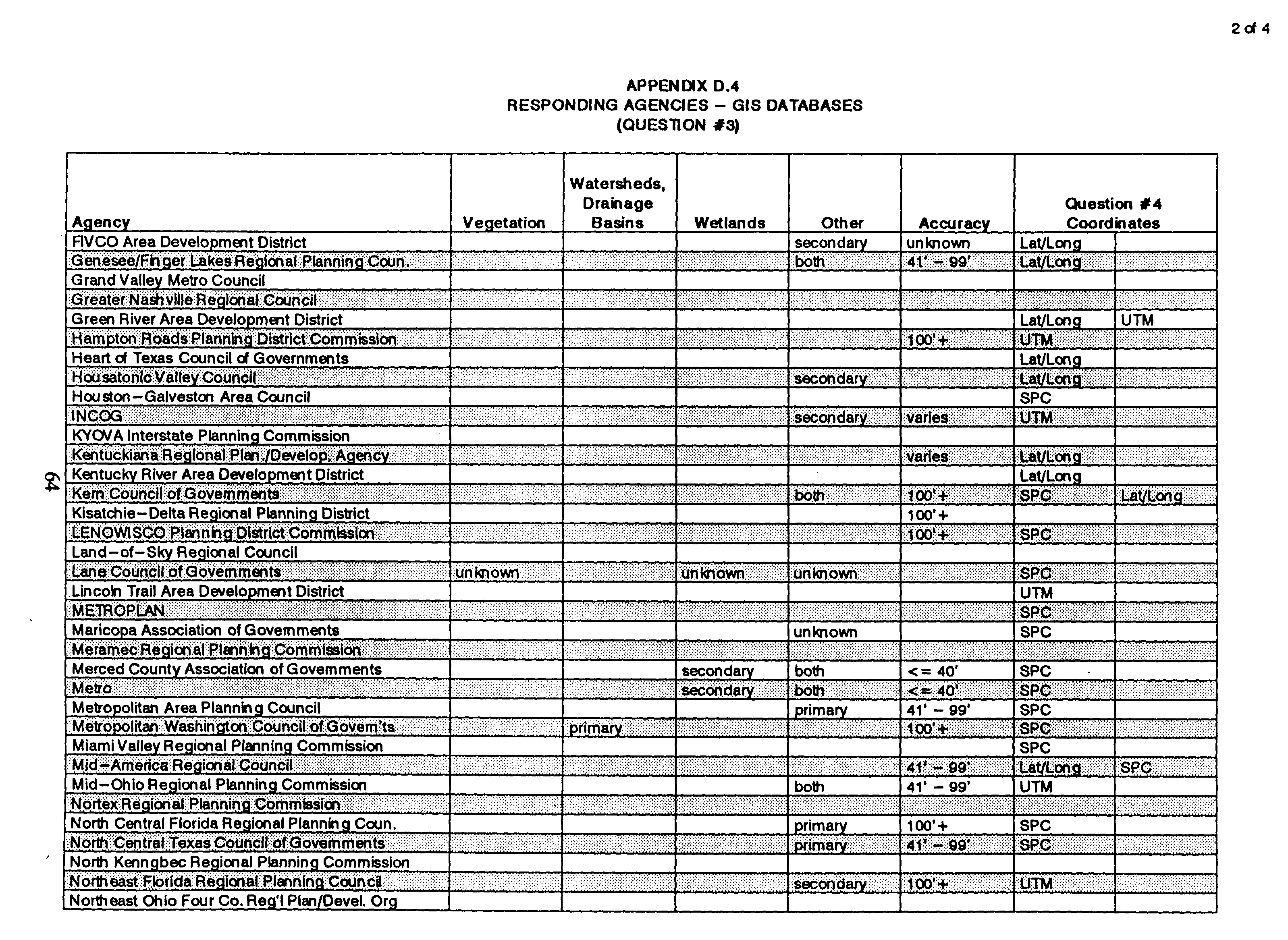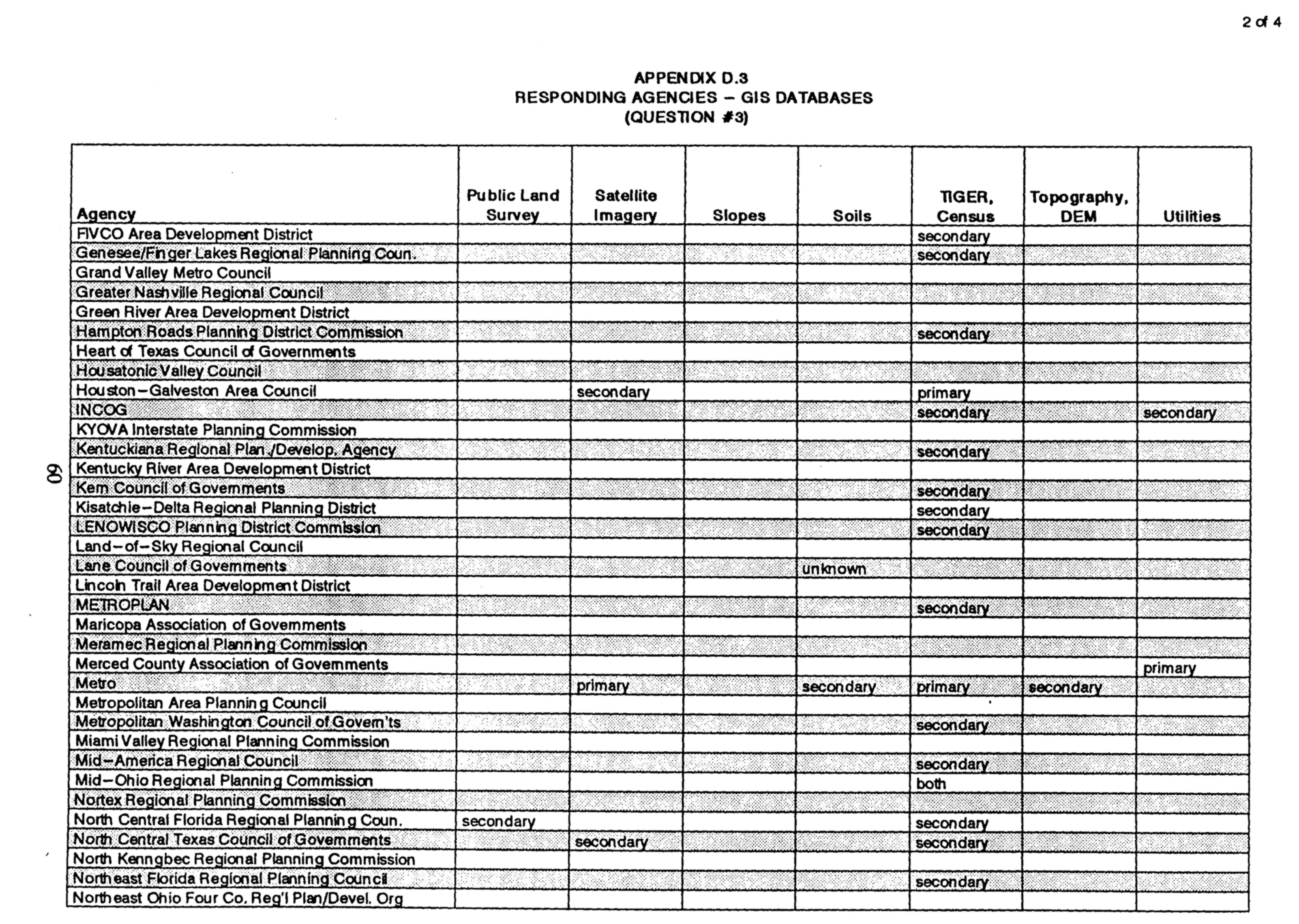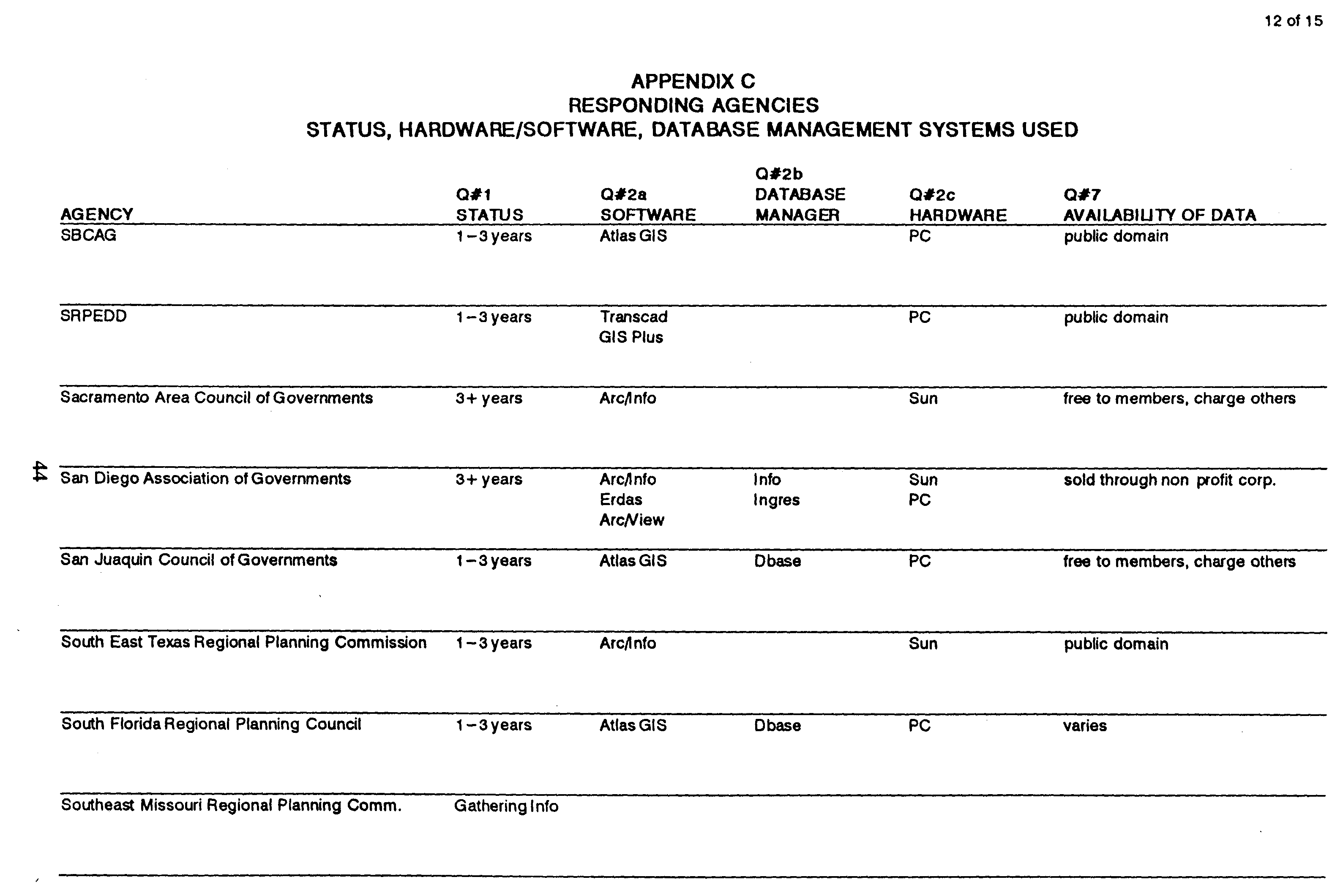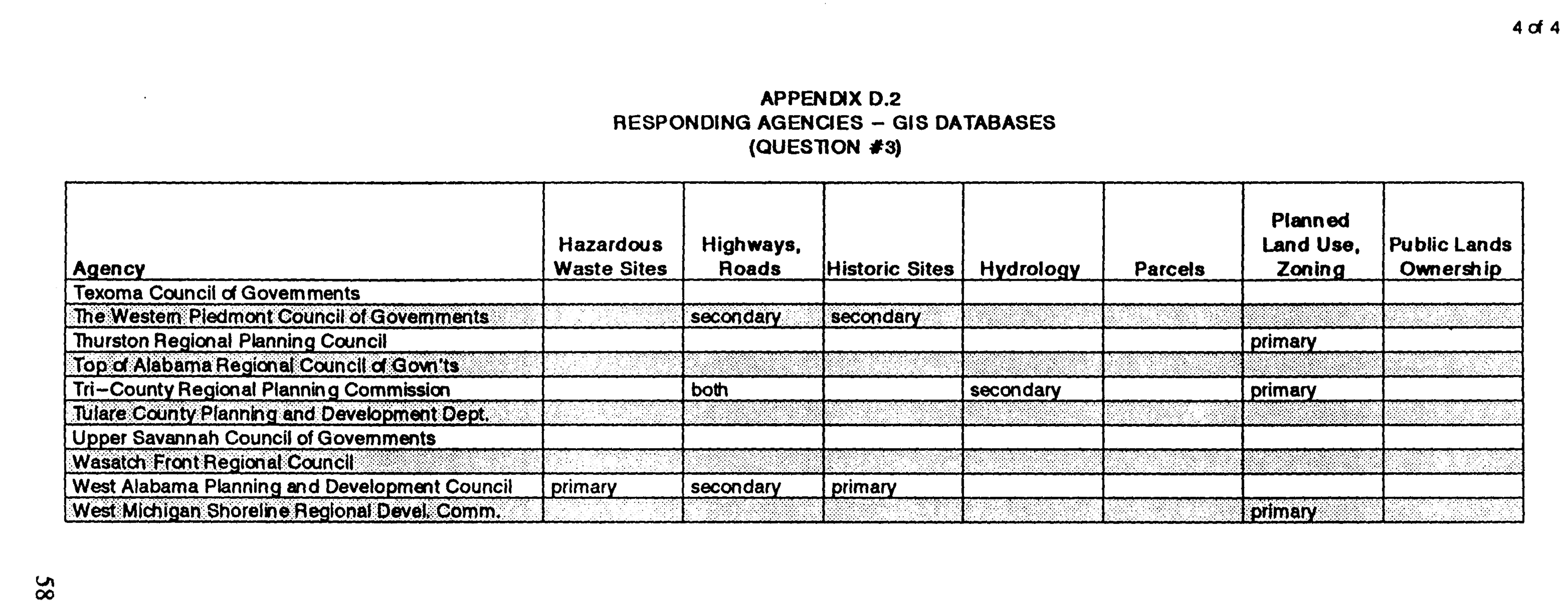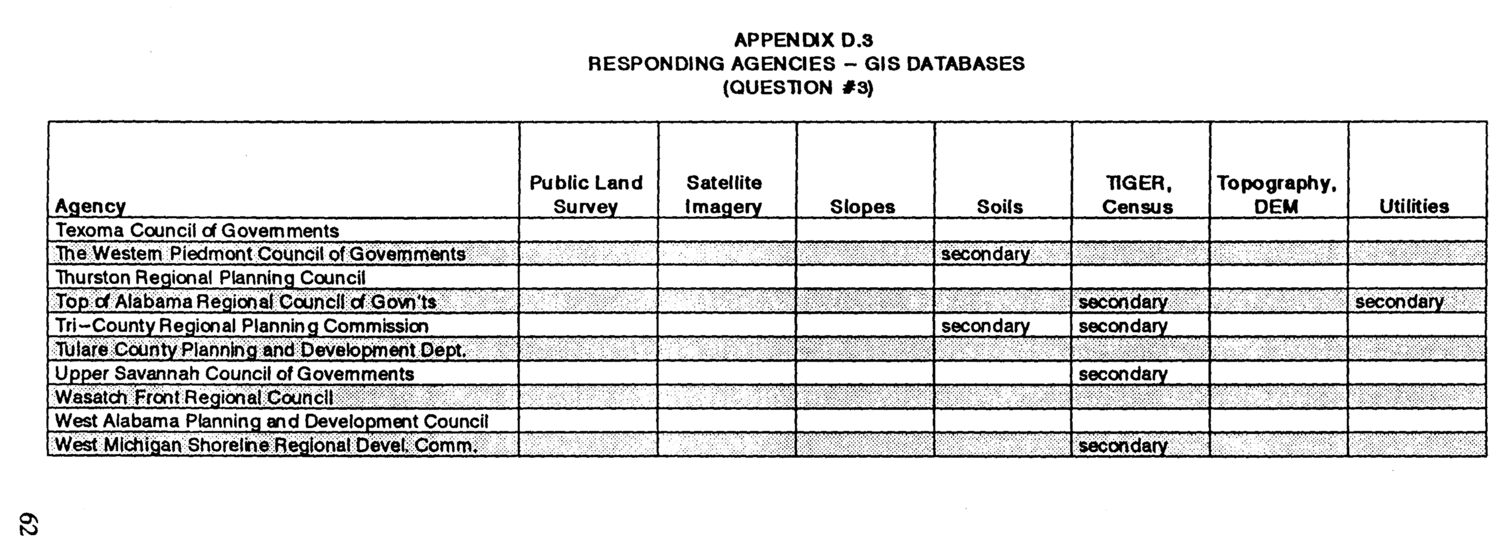 Click HERE for graphic. TABLE OF CONTENTS INTRODUCTION . . . . . . . . . . . . . . . . . . . . . . . . . . . . 3 RESPONSE RATE. . . . . . . . . . . . . . . . . . . . . . . . . . . . 3 STATUS OF GIS USE (QUESTION 1) . . . . . . . . . . . . . . . . . . . 3 SOFTWARE/HARDWARE (QUESTION 2) . . . . . . . . . . . . . . . . . . . 5 DIGITAL DATA BASES (QUESTION 3). . . . . . . . . . . . . . . . . . . 7 GEOGRAPHIC REFERENCE SYSTEM (QUESTION 4) . . . . . . . . . . . . . . 9 FORMAL STANDARDS AND DATA DICTIONARIES (QUESTIONS 5 AND 6). . . . . . . . . . . . . . . . . . . . . . . . . 9 AVAILABILITY OF DATA BASES TO OTHER AGENCIES (QUESTION 7) . . . . . . . . . . . . . . . . . . . . . . . . . . . .10 APPENDICES: A: SURVEY QUESTIONNAIRE . . . . . . . . . . . . . . . . . . . .15 B: RESPONDING AGENCIES - GIS CONTACTS . . . . . . . . . . . . .21 C: RESPONDING AGENCIES - STATUS, HARDWARE/ SOFTWARE, DATABASE MANAGEMENT SYSTEMS USED . . . . . . . . .33 D: RESPONDING AGENCIES - GIS DATABASES. . . . . . . . . . . . .51 iii LIST OF TABLES Table 1 Status of GIS at Councils of Goverment . . . . . . . . . . 4 Table 2 Types of GIS Packages Used . . . . . . . . . . . . . . . . 5 Table 3 Data Base Manager Software Used With GIS . . . . . . . . . 6 Table 4 Types of Hardware Used for GIS . . . . . . . . . . . . . . 7 Table 5 Types of Data Bases Used or Maintained . . . . . . . . . . 8 Table 6 Locational Accuracy of Data Bases. . . . . . . . . . . . . 9 Table 7 Availability of Digital Data . . . . . . . . . . . . . . .10 v SUMMARY OF THE 1994 NARC GEOGRAPHIC INFORMATION SYSTEM (GIS) USER SURVEY SUMMARY OF THE 1994 NARC GEOGRAPHIC INFORMATION SYSTEM (GIS) USER SURVEY INTRODUCTION In January, a Geographic Information System (GIS) User Survey was sent to 182 councils of governinent (COGs) on the National Association of Regional Councils' (NARC) mailing list. In subsequent months, two follow-up mailings were made to non-responding agencies. The survey was an initial effort by NARC's GIS Technical Network to get a better understanding of the use of GIS by COGs, and the types of data bases being used and maintained. The survey was not intended to provide a complete description of each agency's GIS and their applications, but was intentionally kept short to obtain a higher response rate and to provide a general overview of GIS use by councils of government. A copy of the survey instrument can be found in Appendix A. RESPONSE RATE Following the initial January mailout of the survey to the 182 agencies, a total of 43 or 23.6 percent responded. A second mailing was sent to non-responding agencies in February, increasing the response rate to 53.2 percent (97 agencies). As part of NARC's effort to establish a GIS Technical Network, a third mailing to non- responding agencies was made in early March. This final mailing yielded an additional 18 responses, for a total of 114 agencies responding to the survey, or a response rate of 62.6 percent. A list of the responding agencies, with a GIS contact person's name and address, is contained in Appendix B. STATUS OF GIS USE (QUESTION 1) Almost 60 percent of the COGs responding have had a GIS in operation for more than one year, while over one-fifth of the COGs have had a GIS in operation for more than three years. Sixteen agencies (14 percent) responded that they were gathering information about GIS. Table I provides a breakdown of responses to Question 1: "Which of the following best describes your agency regarding the use of a GIS?" 3 Table I STATUS OF GIS AT COUNCILS OF GOVERNMENT # of % of Agencies Total Our functions don't require GIS 0 0% Haven't considered the need for a GIS 0 0% Gathering information about GIS 16 14% Currently implementing a GIS 23 20% Have had a GIS in operation less than 1 year 7 6% Have had a GIS in operation 1 to 3 years 43 38% Have had a GIS in operation for more than 3 years 25 22% TOTAL 114 100% 4 SOFTWARE/HARDWARE (QUESTION 2) Ninety-six agencies indicated that they used at least one GIS software package. Forty-four agencies listed two or more packages. A total of 17 different packages were listed as in use. The top three software packages listed were: Arc/Info - PC Arc/Info (55 users), Atlas GIS (25 users), and MapInfo (18 users). Table 2 provides a breakdown of the number of users for each package. Table 2 TYPES OF GIS PACKAGES USED # of Agencies % of Agencies Using Software Responding ArcCad 7 7% Arc/Info 36 37% PC Arc/Info 19 20% ArcView 12 12% Atlas GIS 25 26% AutoCad 3 3% CAD - Intergraph 1 1% CMap 3 3% Erdas 2 2% Geo/SQL - Generation 5 1 1% GIS Plus 6 6% MapGraphix 2 2% MapInfo 18 19% Strings 1 1% Transcad 2 2% Unisys 1 1% Ultimap 1 1% TOTAL 140* 144%* *A total of 96 agencies responded, with some agencies using more than one package. 5 Fifty-eight agencies indicated that they were using at least one Relational Data Base Management System (RDBMS) package in conjunction with their GIS. Eleven agencies listed two RDBMSs. A total of 17 different RDBMS packages were listed, with various versions of DBase listed by the most agencies (29 users). Table 3 provides a breakdown of the number of users for each package. Table 3 DATA BASE MANAGER SOFTWARE USED WITH GIS # of Agencies % of Agencies Using Software Responding Access 1 2% Alpha4 2 3% DBase 29 50% Empress 1 2% Excel 1 2% FilePro 1 2% FoxBase 3 5% FoxPlus 2 3% FoxPro 4 7% Info 8 14% Ingres 3 5% Oracle 4 7% Paradox 6 10% RBase 1 2% SAS 1 2% Sybase 1 2% Ultimap RCDMS 1 2% TOTAL 69* 120%* *A total of 58 agencies responded, with some agencies using more than one package. 6 Ten different general categories of hardware platforms were listed by 95 agencies responding. Twenty-three agencies listed two different platforms. PCs were listed the most often (75 users), followed by SUN workstations (27 users). Table 4 provides a breakdown of listed hardware platforms. Table 4 TYPES OF HARDWARE USED FOR GIS # of Agencies # of Agencies Using Hardware Responding Apollo 1 1% Apple 1 1% Data General 1 1% HP 700 Series 5 5% I
