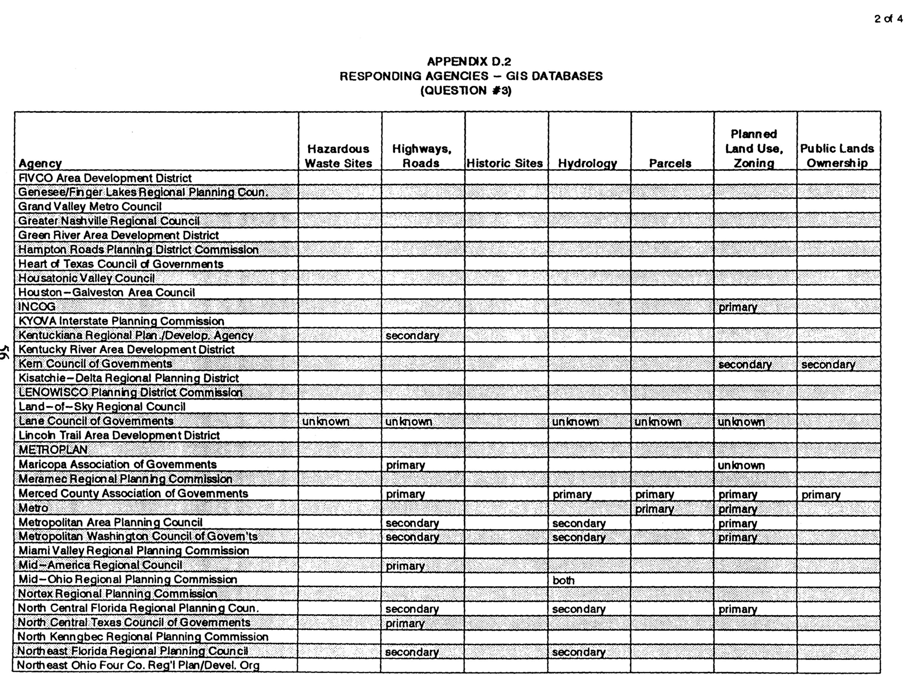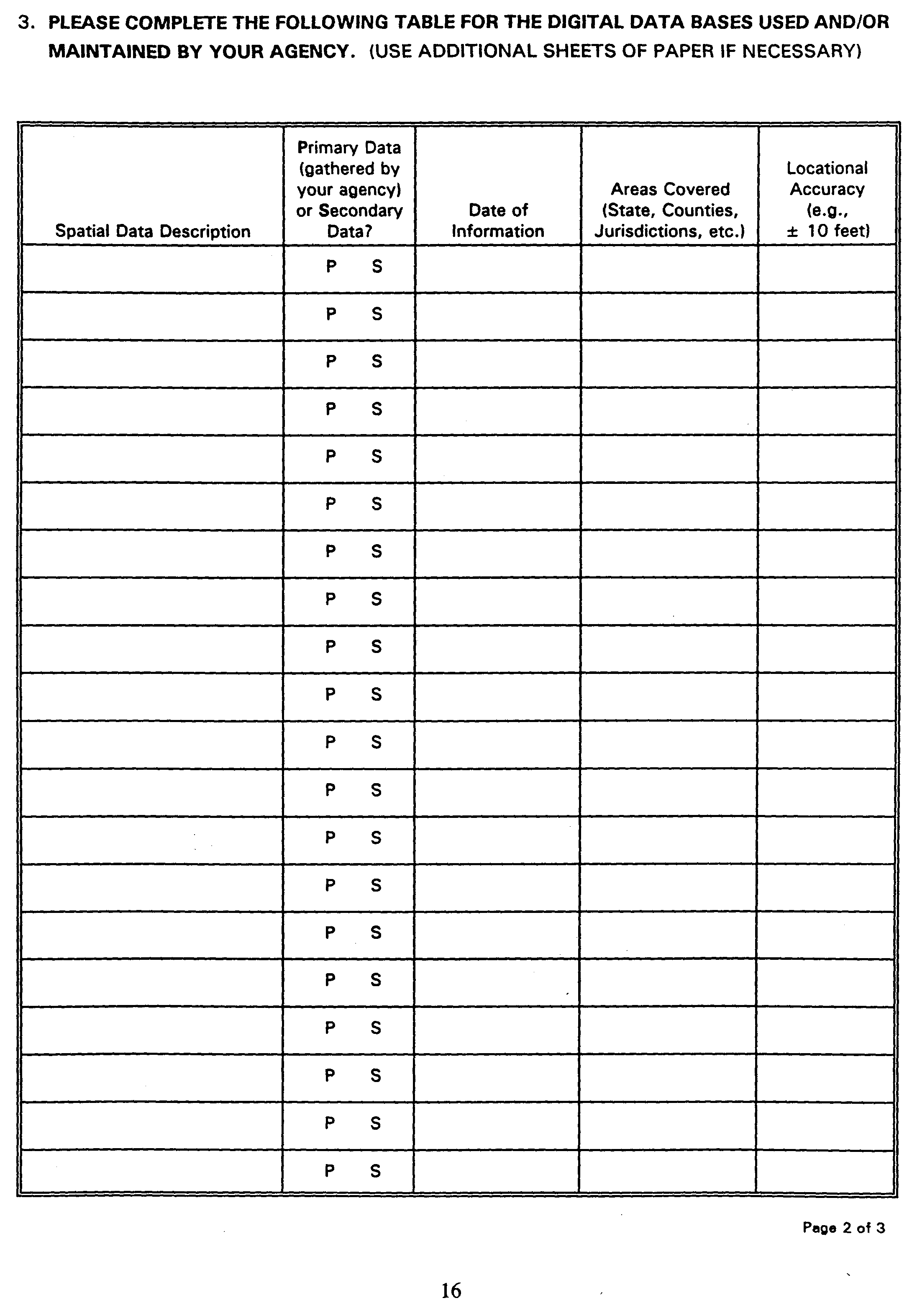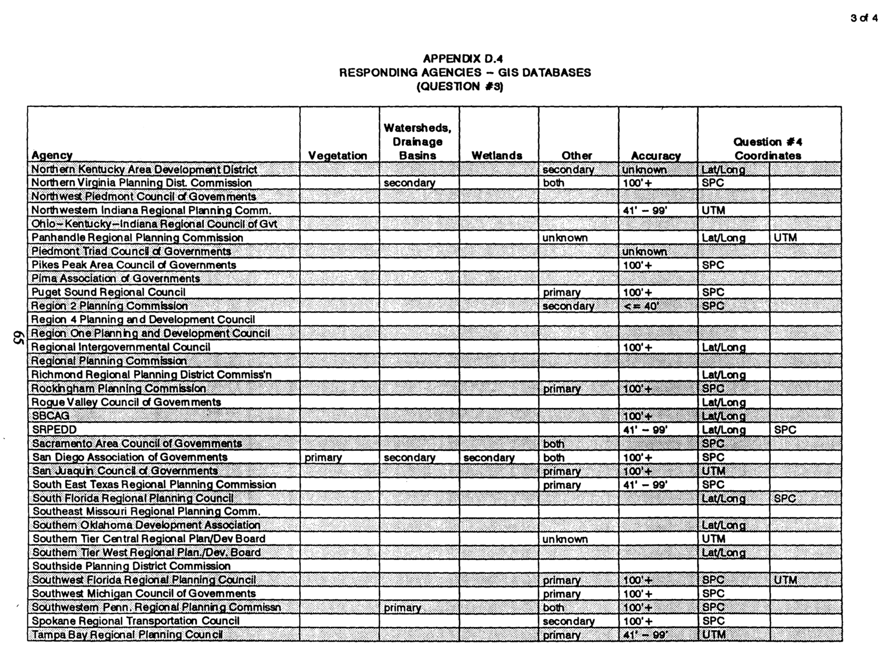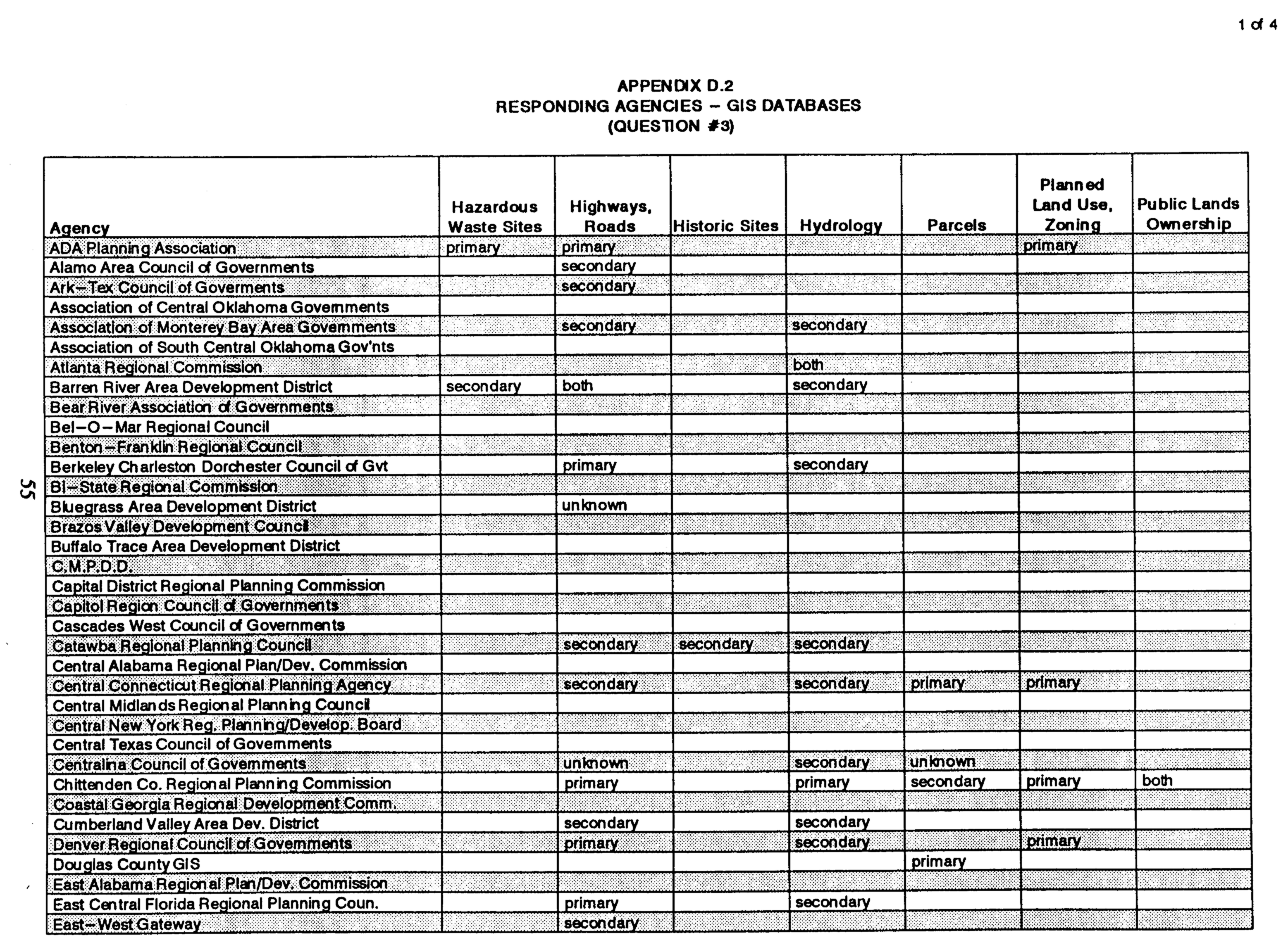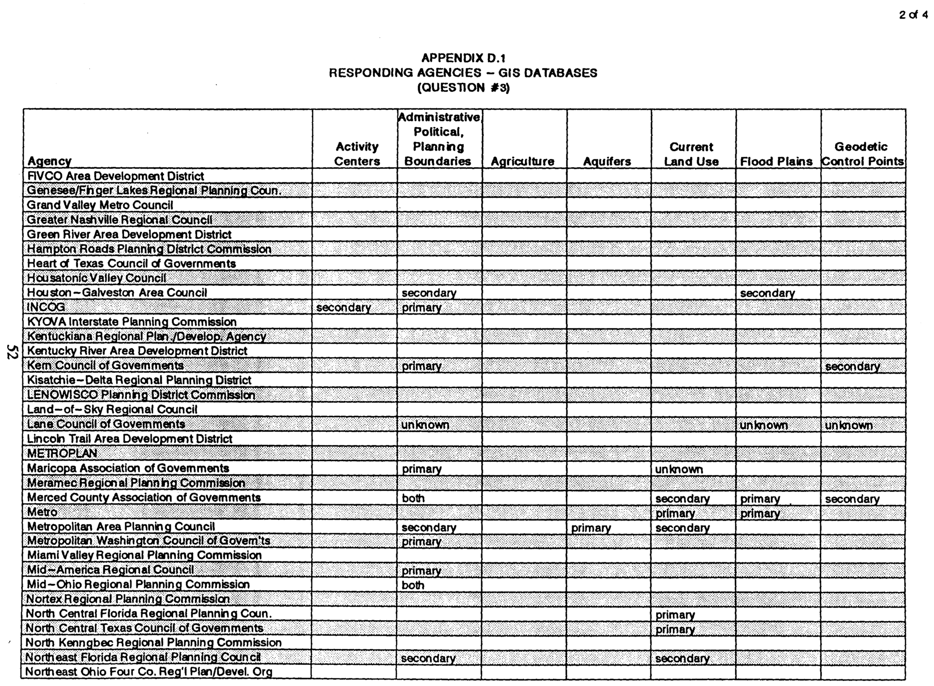 Click HERE for graphic. TABLE OF CONTENTS INTRODUCTION . . . . . . . . . . . . . . . . . . . . . . . . . . . . 3 RESPONSE RATE. . . . . . . . . . . . . . . . . . . . . . . . . . . . 3 STATUS OF GIS USE (QUESTION 1) . . . . . . . . . . . . . . . . . . . 3 SOFTWARE/HARDWARE (QUESTION 2) . . . . . . . . . . . . . . . . . . . 5 DIGITAL DATA BASES (QUESTION 3). . . . . . . . . . . . . . . . . . . 7 GEOGRAPHIC REFERENCE SYSTEM (QUESTION 4) . . . . . . . . . . . . . . 9 FORMAL STANDARDS AND DATA DICTIONARIES (QUESTIONS 5 AND 6). . . . . . . . . . . . . . . . . . . . . . . . . 9 AVAILABILITY OF DATA BASES TO OTHER AGENCIES (QUESTION 7) . . . . . . . . . . . . . . . . . . . . . . . . . . . .10 APPENDICES: A: SURVEY QUESTIONNAIRE . . . . . . . . . . . . . . . . . . . .15 B: RESPONDING AGENCIES - GIS CONTACTS . . . . . . . . . . . . .21 C: RESPONDING AGENCIES - STATUS, HARDWARE/ SOFTWARE, DATABASE MANAGEMENT SYSTEMS USED . . . . . . . . .33 D: RESPONDING AGENCIES - GIS DATABASES. . . . . . . . . . . . .51 iii LIST OF TABLES Table 1 Status of GIS at Councils of Goverment . . . . . . . . . . 4 Table 2 Types of GIS Packages Used . . . . . . . . . . . . . . . . 5 Table 3 Data Base Manager Software Used With GIS . . . . . . . . . 6 Table 4 Types of Hardware Used for GIS . . . . . . . . . . . . . . 7 Table 5 Types of Data Bases Used or Maintained . . . . . . . . . . 8 Table 6 Locational Accuracy of Data Bases. . . . . . . . . . . . . 9 Table 7 Availability of Digital Data . . . . . . . . . . . . . . .10 v SUMMARY OF THE 1994 NARC GEOGRAPHIC INFORMATION SYSTEM (GIS) USER SURVEY SUMMARY OF THE 1994 NARC GEOGRAPHIC INFORMATION SYSTEM (GIS) USER SURVEY INTRODUCTION In January, a Geographic Information System (GIS) User Survey was sent to 182 councils of governinent (COGs) on the National Association of Regional Councils' (NARC) mailing list. In subsequent months, two follow-up mailings were made to non-responding agencies. The survey was an initial effort by NARC's GIS Technical Network to get a better understanding of the use of GIS by COGs, and the types of data bases being used and maintained. The survey was not intended to provide a complete description of each agency's GIS and their applications, but was intentionally kept short to obtain a higher response rate and to provide a general overview of GIS use by councils of government. A copy of the survey instrument can be found in Appendix A. RESPONSE RATE Following the initial January mailout of the survey to the 182 agencies, a total of 43 or 23.6 percent responded. A second mailing was sent to non-responding agencies in February, increasing the response rate to 53.2 percent (97 agencies). As part of NARC's effort to establish a GIS Technical Network, a third mailing to non- responding agencies was made in early March. This final mailing yielded an additional 18 responses, for a total of 114 agencies responding to the survey, or a response rate of 62.6 percent. A list of the responding agencies, with a GIS contact person's name and address, is contained in Appendix B. STATUS OF GIS USE (QUESTION 1) Almost 60 percent of the COGs responding have had a GIS in operation for more than one year, while over one-fifth of the COGs have had a GIS in operation for more than three years. Sixteen agencies (14 percent) responded that they were gathering information about GIS. Table I provides a breakdown of responses to Question 1: "Which of the following best describes your agency regarding the use of a GIS?" 3 Table I STATUS OF GIS AT COUNCILS OF GOVERNMENT # of % of Agencies Total Our functions don't require GIS 0 0% Haven't considered the need for a GIS 0 0% Gathering information about GIS 16 14% Currently implementing a GIS 23 20% Have had a GIS in operation less than 1 year 7 6% Have had a GIS in operation 1 to 3 years 43 38% Have had a GIS in operation for more than 3 years 25 22% TOTAL 114 100% 4 SOFTWARE/HARDWARE (QUESTION 2) Ninety-six agencies indicated that they used at least one GIS software package. Forty-four agencies listed two or more packages. A total of 17 different packages were listed as in use. The top three software packages listed were: Arc/Info - PC Arc/Info (55 users), Atlas GIS (25 users), and MapInfo (18 users). Table 2 provides a breakdown of the number of users for each package. Table 2 TYPES OF GIS PACKAGES USED # of Agencies % of Agencies Using Software Responding ArcCad 7 7% Arc/Info 36 37% PC Arc/Info 19 20% ArcView 12 12% Atlas GIS 25 26% AutoCad 3 3% CAD - Intergraph 1 1% CMap 3 3% Erdas 2 2% Geo/SQL - Generation 5 1 1% GIS Plus 6 6% MapGraphix 2 2% MapInfo 18 19% Strings 1 1% Transcad 2 2% Unisys 1 1% Ultimap 1 1% TOTAL 140* 144%* *A total of 96 agencies responded, with some agencies using more than one package. 5 Fifty-eight agencies indicated that they were using at least one Relational Data Base Management System (RDBMS) package in conjunction with their GIS. Eleven agencies listed two RDBMSs. A total of 17 different RDBMS packages were listed, with various versions of DBase listed by the most agencies (29 users). Table 3 provides a breakdown of the number of users for each package. Table 3 DATA BASE MANAGER SOFTWARE USED WITH GIS # of Agencies % of Agencies Using Software Responding Access 1 2% Alpha4 2 3% DBase 29 50% Empress 1 2% Excel 1 2% FilePro 1 2% FoxBase 3 5% FoxPlus 2 3% FoxPro 4 7% Info 8 14% Ingres 3 5% Oracle 4 7% Paradox 6 10% RBase 1 2% SAS 1 2% Sybase 1 2% Ultimap RCDMS 1 2% TOTAL 69* 120%* *A total of 58 agencies responded, with some agencies using more than one package. 6 Ten different general categories of hardware platforms were listed by 95 agencies responding. Twenty-three agencies listed two different platforms. PCs were listed the most often (75 users), followed by SUN workstations (27 users). Table 4 provides a breakdown of listed hardware platforms. Table 4 TYPES OF HARDWARE USED FOR GIS # of Agencies # of Agencies Using Hardware Responding Apollo 1 1% Apple 1 1% Data General 1 1% HP 700 Series 5 5% I