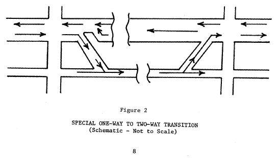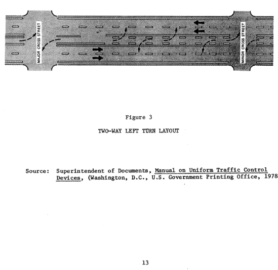 Click HERE for graphic. PREFACE This publication is part of a series entitled Transportation Planning for Your Community and is designed to acquaint officials and planners with transportation planning for communities of from 25,000 to 200,000 population. The series consists of two guides that explain the concepts of transportation planning and five technical manuals that describe techniques for carrying out transportation planning programs. The guides are: A Guide for the Decisionmaker and The Manager's Guide for Developing a Planning Program. The five technical manuals are titled: Traffic Planning Transit Planning System Planning Monitoring and Forecasting Programming Projects A Guide for the Decisionmaker describes the importance of urban transportation and the benefits of transportation planning. It includes a review of how transportation planning works, and the role of city, county and town officials in transportation planning. The Manager's Guide for Developing a Planning Program describes the principles of transportation planning and is directed to those engineers, planners and administrators who are charged with the responsibility of organizing and administering the transportation planning program. The individual technical manuals describe transportation planning techniques appropriate for small communities. The manuals also include references to other publications that describe appropriate planning techniques. The Traffic Planning manual is a reference of basic traffic engineering techniques and their potential for improving traffic flow and traffic safety of urban arterial streets and highways. The manual identifies the traffic engineering measures appropriate for consideration in development of transportation improvement plans and programs. The Transit Planning manual includes techniques for estimating transit patronage, service options, and operating requirements. Also included are procedures for evaluating the need for specialized services for the elderly and handicapped. i For sale by the Superintendent of Documents, U.S. Government Printing Office, Washington. D.C. 20402 The System Planning manual details the steps required for the functional classification of streets and highways, the estimation of future traffic, the estimation of the impacts of future traffic, and the estimation of street and highway system requirements. An Appendix includes alternative methods for forecasting traffic. The Monitoring and Forecasting manual provides instructions for assembling inventories of transportation and land activity. It describes methods for monitoring the performance of the transportation system and general community development and methods for forecasting information needed in urban transportation planning. The Programming Projects manual contains procedures for development of the transportation improvement program. Included are procedures for identification of candidate improvement projects, determination of the plan to fund candidate improvement.projects, assignment of priorities to candidate improvement projects, budget allocation and project scheduling, and monitoring, adjusting and evaluating the programs. This series was prepared by the COMSIS Corporation and the Highway Users Federation for Safety and Mobility under a grant from the Federal Highway Administration with the aid of a "steering committee" made up of the following officials: Dan C. Dees Illinois Department of Transportation Springfield, Illinois James Echols Tidewater Transportation Commission Norfolk, Virginia David D. Grayson Automobile Club of Southern California Los Angeles, California John J. Holland Cumberland County Planning Board Bridgeton, New Jersey F.W. Landers Department of Public Works Worcester, Massachusetts Marion R. Poole North Carolina Department of Transportation Raleigh, North Carolina ii The principal investigators were: Arthur B. Sosslau COMSIS Corporation Wheaton, Maryland Marshall F. Reed, Jr. Highway Users Federation for Safety and Mobility Washington, D.C. Other principal authors were Maurice M. Carter of COMSIS Corporation and Woodrow W. Rankin of the Highway Users Federation. TABLE OF CONTENTS Page PREFACE . . . . . . . . . . . . . . . . . . . . . . . . . . . . . 1 INTRODUCTION. . . . . . . . . . . . . . . . . . . . . . . . . . . 1 CHAPTER ONE: TRAFFIC ENGINEERING MEASURES TO IMPROVE FLOW . . . . 2 Traffic Flow Studies . . . . . . . . . . . . . . . . . . . . 2 Initial Problem Identification . . . . . . . . . . . . . . . 2 Improvement Measures . . . . . . . . . . . . . . . . . . . . 3 Traffic Signal Improvements. . . . . . . . . . . . . . . . . 4 Cycle Length . . . . . . . . . . . . . . . . . . . . . . . . 4 Cycle Split. . . . . . . . . . . . . . . . . . . . . . . . . 5 Turn Controls at Traffic Signals . . . . . . . . . . . . . . 5 Signal Coordination. . . . . . . . . . . . . . . . . . . . . 6 Parking Controls . . . . . . . . . . . . . . . . . . . . . . 6 One-Way Streets. . . . . . . . . . . . . . . . . . . . . . . 7 Unbalanced Flow. . . . . . . . . . . . . . . . . . . . . . . 9 Reserved Lanes For High Occupancy Vehicles . . . . . . . . .10 Access Controls. . . . . . . . . . . . . . . . . . . . . . .10 Two-Way Left Turn Lanes. . . . . . . . . . . . . . . . . . .10 Minor Physical Improvements. . . . . . . . . . . . . . . . .14 Offstreet Parking. . . . . . . . . . . . . . . . . . . . . .14 Use of Traffic Control Devices . . . . . . . . . . . . . . .16 Enforcement. . . . . . . . . . . . . . . . . . . . . . . . .16 Improvement Priorities . . . . . . . . . . . . . . . . . . .17 CHAPTER TWO: TRAFFIC ENGINEERING MEASURES TO IMPROVE SAFETY . . .18 CHAPTER THREE: VOLUME REDUCTION TRAFFIC IMPROVEMENT MEASURES. . .20 Auto Restricted Zones. . . . . . . . . . . . . . . . . . . .20 Carpools and Vanpools. . . . . . . . . . . . . . . . . . . .20 Variable Work Hours. . . . . . . . . . . . . . . . . . . . .21 Bus Lanes. . . . . . . . . . . . . . . . . . . . . . . . . .21 CHAPTER FOUR: ADMINISTRATION O