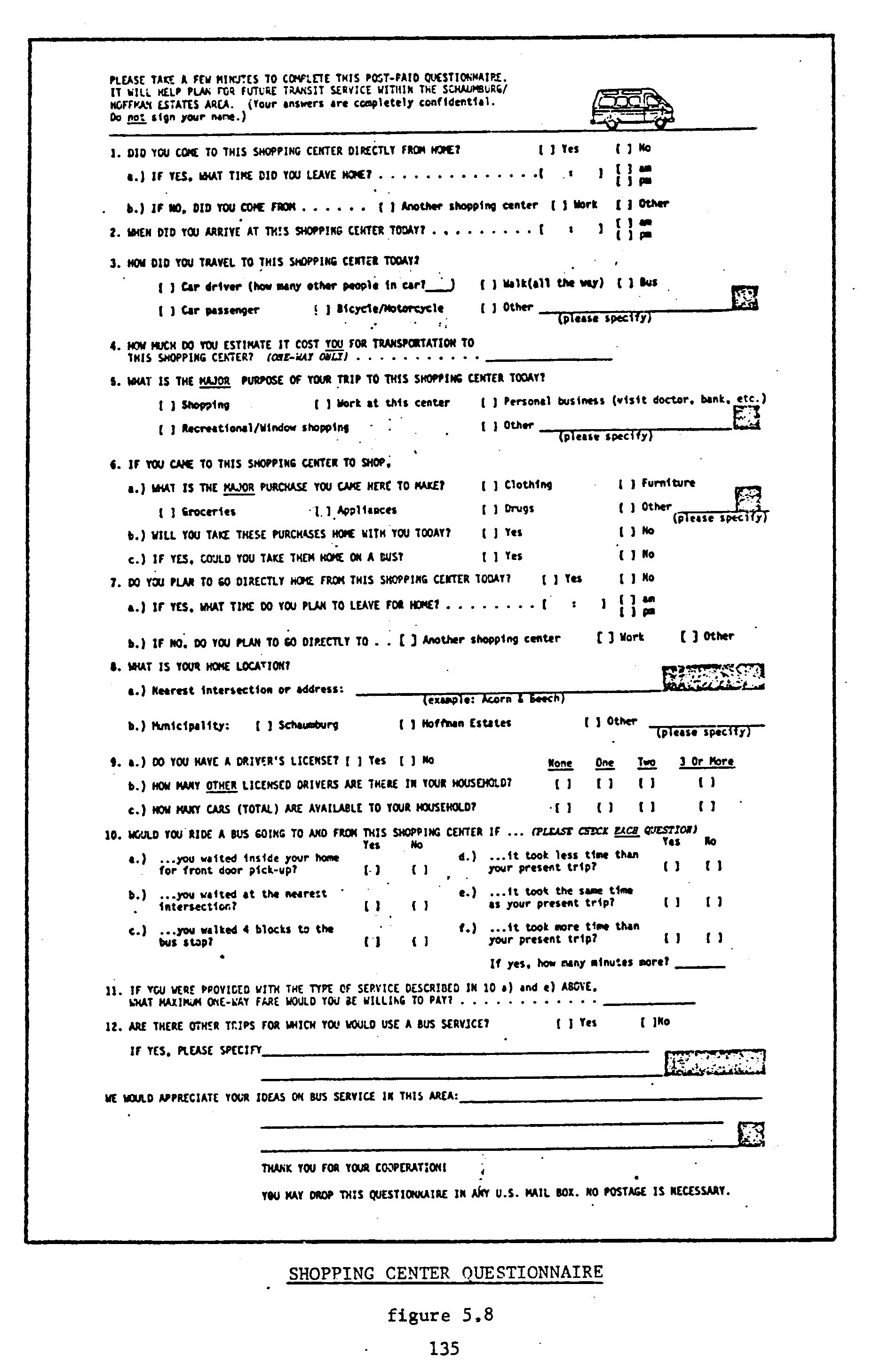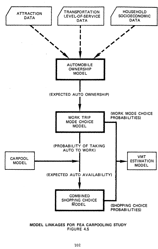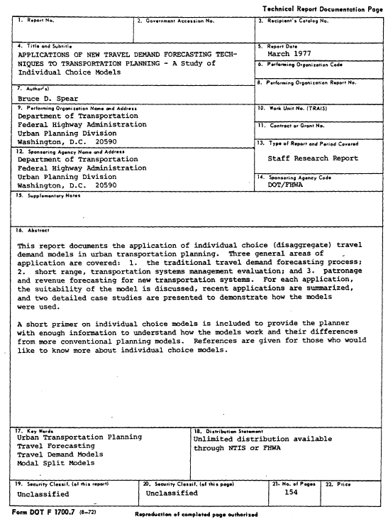 Click HERE for graphic. NOTICE This document is disseminated under the sponsorship of the Department of Transportation in the interest of information exchange. The United States Government assumes no liability for its contents or use thereof. Click HERE for graphic. APPLICATIONS OF NEW TRAVEL DEMAND FORECASTING TECHNIQUES TO TRANSPORTATION PLANNING A Study of Individual Choice Models Prepared by Bruce D. Spear March 1977 U.S. Department of Transportation Federal Highway Administration Office of Highway Planning Urban Planning Division For sale by the Superintendent of Documents, U.S. Government Printing Office, Washington, D.C. 20402 TABLE OF CONTENTS Acknowledgements. . . . . . . . . . . . . . . . . . . . . . . . iv. List of Figures . . . . . . . . . . . . . . . . . . . . . . . . .v. List of Tables. . . . . . . . . . . . . . . . . . . . . . . . . vi. CHAPTER I. INTRODUCTION. . . . . . . . . . . . . . . . . . . . . . 1 II. AN OVERVIEW OF INDIVIDUAL CHOICE MODELS . . . . . . . . 5 Background. . . . . . . . . . . . . . . . . . . . . . . 5 The General Structure. of individual Choice Models. . . 6 Properties of Individual Choice Models and Their Implications for Transportation Planning. . . . . . . .10 Summary . . . . . . . . . . . . . . . . . . . . . . . .17 References - Early Research in individual Choice Models. . . . . . . . . . . . . . . . . . . . . . . . .18 III. INDIVIDUAL CHOICE MODELS AS ELEMENTS IN THE TRADITIONAL TRAVEL DEMAND FORECASTING PROCESS . . . . . . . . . . .19 Background. . . . . . . . . . . . . . . . . . . . . . .19 Suitability of Individual Choice Models for Mode Split Analysis. . . . . . . . . . . . . . . . . . . . .21 A Summary of Recent Applications. . . . . . . . . . . .24 References. . . . . . . . . . . . . . . . . . . . . . .33 CASE STUDY NO. 1 - AN INDIVIDUAL CHOICE MODEL FOR SAN DIEGO . . . . . . . . . . . . . . . . . . . . . . . . .34 Background. . . . . . . . . . . . . . . . . . . . . . .34 Description of the Model. . . . . . . . . . . . . . . .34 Data Preparation. . . . . . . . . . . . . . . . . . . .36 Model Development and Calibration . . . . . . . . . . .37 Model Validation and Sensitivity Tests. . . . . . . . .40 Application of the Model as a Planning Tool . . . . . .41 i CASE STUDY NO. 2 - THE DEVELOPMENT OF MODE CHOICE MODELS FOR THE TWIN CITIES AREA. . . . . . . . . . . . . . . .47 Background. . . . . . . . . . . . . . . . . . . . . . .47 Description of the Models . . . . . . . . . . . . . . .48 Data Preparation. . . . . . . . . . . . . . . . . . . .49 Model Calibration . . . . . . . . . . . . . . . . . . .51 Model Validation. . . . . . . . . . . . . . . . . . . .59 Sensitivity Analysis. . . . . . . . . . . . . . . . . .61 Application of the Models in the Planning Process . . .65 IV. EVALUATING TRANSPORTATION SYSTEM MANAGEMENT POLICIES WITH INDIVIDUAL CHOICE MODELS. . . . . . . . . . . . . . . .67 Background. . . . . . . . . . . . . . . . . . . . . . .67 The Suitability of Individual Choice Models for TSM Planning. . . . . . . . . . . . . . . . . . . . . .68 A Summary of Recent Applications. . . . . . . . . . . .72 References. . . . . . . . . . . . . . . . . . . . . . .81 CASE STUDY NO. 3 - EVALUATING THE IMPACT OF POLLUTION CONTROL STRATEGIES ON REGIONAL TRAVEL DEMAND. . . . . .82 Background. . . . . . . . . . . . . . . . . . . . . . .82 Description of the Models . . . . . . . . . . . . . . .82 Application of the Models to Los Angeles Data . . . . .87 Results of Policy Analysis. . . . . . . . . . . . . . .90 CASE STUDY No. 4 - EVALUATING THE EFFECTIVENESS OF CARPOOLING INCENTIVES AT REDUCING FUEL CONSUMPTION. . .94 Background. . . . . . . . . . . . . . . . . . . . . . .94 Description of the Models . . . . . . . . . . . . . . .94 Forecasting Procedure for the Models. . . . . . . . . 103 Results of Policy Analysis. . . . . . . . . . . . . . 105 V. FORECASTING THE DEMAND FOR NEW TRANSPORTATION SYSTEMS AND MAJOR SERVICE IMPROVEMENTS . . . . . 111 Background. . . . . . . . . . . . . . . . . . . . . . 111 The Suitability of Individual Choice Models for New Mode Demand Forecasting . . . . . . . . . . . . . 112 A Summary of Recent Applications. . . . . . . . . . . 114 References. . . . . . . . . . . . . . . . . . . . . . 120 ii CASE STUDY NO. 5 - STUDYING THE FEASIBILITY OF FEEDER BUS SERVICE TO A SUBURBAN RAILROAD STATION. . . . . . . . 121 Background. . . . . . . . . . . . . . . . . . . . . . 121 Description of the Model. . . . . . . . . . . . . . . 121 Data Preparation and Forecasting Procedure. . . . . . 122 Demand and Revenue 'Projections . . . . . . . . . . . 125 Cost Estimates and Economic Analysis. . . . . . . . . 127 CASE STUDY NO. 6 - DESIGNING A PUBLIC TRANSPORTATION SYSTEM FOR SUBURBAN COMMUNITIES . . . . . . . . . . . 131 Background. . . . . . . . . . . . . . . . . . . . . . 131 Description of the Models . . . . . . . . . . . . . . 132 Data Preparation and Demand Forecasting Procedures. . 134 Analysis of Alternative Systems . . . . . . . . . . . 139 APPENDICES A. ISSUES WHICH HAVE EMERGED FROM INDIVIDUAL CHOICE MODEL RESEARCH. . . . . . . . . . . . . . . . . . . . 143 B. WHERE TO OBTAIN REFERENCES LISTED IN THIS REPORT . . 153 iii ACKNOWLEDGEMENTS I wish to thank the many individuals who provided me with valuable information and comments during the preparation of this report. I am especially grateful to: Mr. John C. Bennett - Peat, Marwick,, Mitchell & Co., Washington, DC. Mr. Daniel Brand - Executive Office of Transportation and-Construction, Boston, MA. Mr. Raymond H. Ellis - Peat, Marwick, Mitchell & Co., Washington, DC. Mr. David S. Gendell - Federal Highway Administration, Washington, DC. Ms. Nancy Hammond - Metropolitan Transportation Commission, Berkeley, CA. Dr. David T. Hartgen - New York State Department of Transportation, Albany, NY. Mr. Kevin E. Heanue - Federal Highway Administration, Washington, DC. Mr. Thomas J. Hillegass - Urban Mass Transportation Administration, Washington, DC. Mr. John F. Hoffmeister, III - Metropolitan Counci
