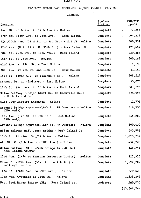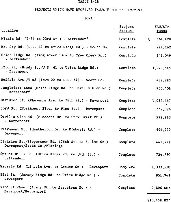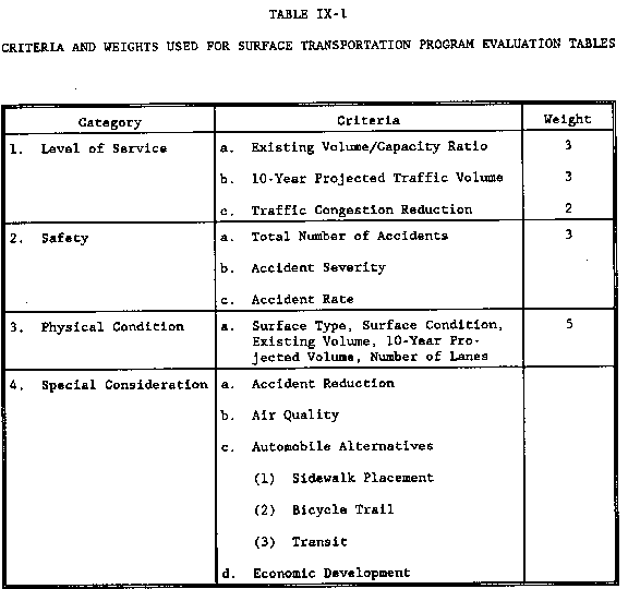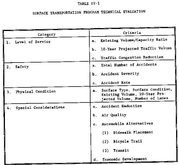 Click HERE for graphic. Surface Transportation Program (formerly Federal-Aid Urban Program) Evaluation Manual Bi-State Regional Commission Revised May, 1993 (April, 1985) This report was prepared in cooperation with the U.S. Department of Transportation, Federal Highway Administration; the Illinois Department of Transportation; and the Iowa Department of Transportation. The contents of this report reflect the views of the author who is responsible for the facts and the accuracy of the data presented herein. The contents do not necessarily reflect the official views or policies of the Illinois Department of Transportation, the Iowa Department of Transportation, or the Federal Highway Administration. This report does not constitute a standard, specification or regulation. Bi-State Regional Commission P. 0. Box 3368 1504 Third Avenue Rock Island, Illinois 61204-3368 601-2 BI-STATE REGIONAL COMMISSION Charles Seaman, Chair Wayne Anderson Arthur Ash Linda J. Bloodsworth Dewey Colter Bill Fennelly Robert W. Garman Pat Gibbs William T. Green James Hancock Allen Haut George C. Heninger Sandra S. Huston Ann Hutchinson Chad James John Keig Stan Leach Mary Ellen Lobaito Francis Marlier Paul E. Mulcahey Scott H. Newberg Tom C. Nicholson LeRoy Petersen Celia Rangel Ruth Reynolds Simon O. Roberts A. Francis Roederer Brian M. Roesler Mark W. Schwiebert Elizabeth Sherwin Grace Diaz Shirk Walter Tiller William Ward William C. Weaver Thomas A. Wilson Edwin G. Winborn BI-STATE REGIONAL COMMISSION STAFF Gary B. Vallem, Executive Director Denise L. Bulat, Transportation and Environmental Services Director Jill L. Guth, Community and Economic Development Director Virginia A. McKee, Administrative Services Director Elizabeth A. Murray, Intergovernmental Services Director Marvin C. Webb, Aging Director Patricia S. Laas, Dietitian Steven G. Ames, Planner III Carole L. Boyles, Planner III Kristi K. Conway, Planner III Stacy A. DePorter, Planner III Catherine Pratscher-Woods, Planner III Gena Standaert, Planner III Chong Qing Wu, Planner III Patrick S. Marsh, Planner II David W. Tallman, Planner II Janice M. Townsend, Planner II Patrick J. Weidemann, Planner II Donna A. Moritz, Controller Patty Gregory, Graphics Specialist Lisa J. Miller, Graphics Specialist Janet L. Hill, Word Processing Coordinator Carol L. Connors, Word Proc./Acct. Clerk Leslie A. Mose, Word Processor Pearlee Carpenter, Clerk-Typist/Recep. Faye DeBisschop, Older Worker Spec. II Paul Burden, Older Worker Specialist I Joan Lopez, Ethnic Meals Cook Jason M. Moritz, Planning Assistant Jill K. Ellestad, Planning Assistant 5-1-93 900-18 ii TRANSPORTATION POLICY COMMITTEE (1) Ann Hutchinson, Mayor City of Bettendorf, Iowa Edwin Winborn, Chairman Scott County Board of Supervisors Pat Gibbs, Mayor City of Davenport, Iowa Thomas Moritz, Alderman City of Davenport, Iowa John Rodgers, Mayor City of Riverdale, Iowa Ron Leiby, Mayor (3) City of LeClaire, Iowa Ian MacGillivray, Director Planning and Research Division Iowa Department of Transportation (Alternate: Lee Benfield, District Transportation Planner) H. A. Willard (ex-officio, non-voting) Division Administrator Federal Highway Administration - IA Lee Waddleton (ex-officio, non-voting) Administrator, Federal Transit Administration - Region VII Paul Mulcahey, Chairman Rock Island County Board Mark Schwiebert, Mayor (2) City of Rock Island Stan Leach, Mayor City of Moline, Illinois William Ward, Mayor City of East Moline, Illinois Bob Steele, Mayor (3) City of Silvis, Illinois Lawrence Lorenzen, Chairman Rock Island County Metropolitan Mass Transit District William Ost, District Engineer Illinois Department of Transportatio+w (Alternate: Larry Reed, Engineer of Program Development) Jay W. Miller (ex-officio, non-voting) Division Administrator Federal Highway Administration - IL Art Ash Henry County Charles Seaman, President (4) Colona Village Board of Trustees (1). The Policy Committee voting is restricted to one vote for each voting member with no proxy voting permitted with the following exception: the Illinois and Iowa Departments of Transportation are each allowed one designated alternate representative. These representatives have voting privileges in the absence of their designated Committee members. (2). Chairman, Transportation Policy Committee. (3). The mayors of the Cities of LeClaire, Eldridge, Buffalo and Panorama Park in the Iowa portion and Milan, Silvis, Coal Valley, Carbon Cliff, Hampton, and Oak Grove in the Illinois portion select a representative from their jurisdictions (Iowa and Illinois separately) to represent them on the Policy and Technical Committees. (4). Chairman, Bi-State Regional Commission. 600-44 iii TRANSPORTATION TECHNICAL COMMITTEE Larry Mattusch, County Engineer Greg Champagne Scott County, Iowa Dept. of Community & Economic Development City of Rock Island, Illinois Clayton Lloyd Community Development Director Joseph Reckard City of Davenport, Iowa Director of Planning & Development City of Moline, Illinois Byron Baxter, Director Dept. of Municipal Transportation John Hoffstatter, City Engineer City of Davenport, City of Moline, Iowa Illinois Patrick McGrath, City Engineer Bill Lauper, City City of Davenport, Iowa Engineer City of East Moline, Illinois Jerry Springer Robert Hawes, Public Public Works Director Works Director City City of Bettendorf, Iowa of Rock Island, Illinois Dick Kvach Steve Seiver, Community Development Village City of Bettendorf, Administrator (2) Iowa Village of Milan, Illinois Edwin Choate, City Administrator (2) John Dowd, City City of LeClaire, Iowa Administrator City of Eldridge, Lee Benfield Iowa District Transportation Planner Jeff Nelson, General Iowa Department of Manager (3) Transportation Rock Island County Metropolitan Lee Benfield Mass Transit District District Transportation Planner Iowa Department of Steve Van Dyke Transportation Director of Developmental Services City of East Moline, Illinois Gary Vallem, Executive Director Mark Pet