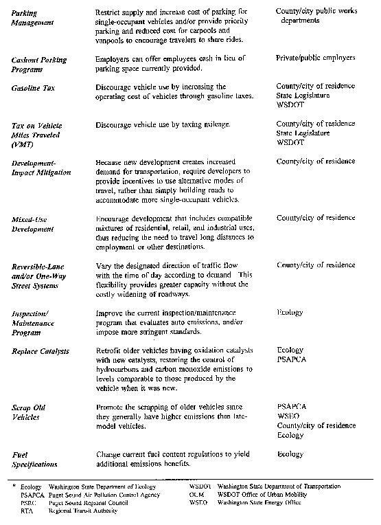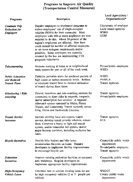 Click HERE for graphic. The Link Between Driving and Air Pollution Vehicle exhaust is the leading source of hazardous air pollution in Washington State. While air quality has improved in the central Puget Sound region, population and employment growth will undoubtedly lead to more and more vehicles on the roads, and more pollutants in the air. This brochure explains the link between air quality and driving, and the health impacts of poor air quality. Some promising air- quality improvement efforts are described, as well as some personal strategies you can undertake to decrease the number of trips you take and the number of miles you drive. Impacts of Air Pollution Even though emission-control equipment has reduced the amount of pollution produced by motor vehicles, Puget Sound area residents continue to drive in ever increasing numbers. Over the past 10 years, they have increased the amount they drive by more than 70 percent. Although the forecasted growth in vehicle miles of travel for the year 2020 is not quite so dramatic as that of the past 10 years, the increase is expected to be at least 40 percent.' With the increase in driving, the health impacts of air pollution have come into focus. Automobile emissions are the major cause of air pollution which comes in a number of forms, but those we're most concerned about in this region are ozone, carbon monoxide, and particulate matter. * Vehicle Exhaust is the leading source of hazardous air pollution in the state - Ozone is the principal component of smog. It causes breathing problems, reduced lung function, asthma, eye and nose irritation, and reduced resistance to colds and other infections. - Carbon monoxide reduces the ability of blood to bring oxygen to body cells and tissues. It may be particularly hazardous to people who have heart or circulatory problems and people who have damaged lungs or breathing passages. - Particulate matter, a pollutant that causes nose and throat irritation, lung damage and bronchitis, is caused in large part by diesel vehicles and by road dust suspended in the air by moving vehicles. - These forms of air pollution also decrease visibility and damage plants and trees. They can eat away stone, damaging historic buildings, monuments and statues. The health impacts of driving are of great concern to the public. More than three quarters of the respondents in a 1993 survey believed that automobile emissions contribute a great deal to air pollution in the Puget Sound area. Respondents indicated that the most important reason for maintaining or improving air quality was to avoid the health risks of air pollution. (1) Puget Sound Regional Council forecasts (10/94) (2) Random Sample Public Opinion Survey of Air pollution in Puget Sound Region, Puget Sound Air Pollution Control Agency, 1993. New Rules Say Transportation Improvements Cannot Worsen Air Quality As a consequence of poor air quality due to vehicle emissions, federal and state air quality regulations specifically target auto emissions and auto travel. Our region must attain and maintain air quality standards for ozone, carbon monoxide and particulate matter. If air quality falls below set standards, the federal government can impose dramatic sanctions, including the increased controls on industry and the withholding of federal transportation dollars earmarked for the central Puget Sound region. Further, state and local governments would be forced to adopt programs that may limit the amount of miles we drive each year. The region has proven that it is in compliance with federal air quality standards at this time. To ensure that we maintain those standards, air quality will be monitored constantly, and a regional air-quality maintenance plan will soon be put in place by the Puget Sound Air Pollution Control Agency (PSAPCA). * The worst air pollution happens when your car is warming up - during the first few miles of travel. In addition to maintaining air quality, all major transportation improvements in Washington State must prove that they do not worsen air quality. Proposed projects are tested to ensure their consistency with air quality regulations. If they worsen air quality, they cannot receive local, state or federal funding. Without this funding, most transportation projects would never be built. This relatively new constraint placed on transportation project funding will become increasingly important as our region grows. Local Efforts Target Auto Travel Dramatic congestion on our freeways and arterial streets hasn't deterred driving. In fact, driving is on the increase with noncommute trips now accounting for more traffic volume than peak- hour commute trips! The Puget Sound Regional Council, the Puget Sound Air Pollution Control Agency, the Washington State Department of Transportation, the State Department of Ecology, the Washington State Energy Office and local jurisdictions in King, Pierce, Snohomish and Kitsap Counties are working to improve air quality by reducing vehicle emissions. The Regional Council is identifying and assessing strategies to decrease mobile-source air emissions. These Transportation Control Measures-or @com#)ute TCMs-are being tested for their effectiveness at reducing vehicle emissions. They will be implemented by the state, regional, and local agencies as needed to maintain and improve air quality. * Noncommute trips outnumber commute trips 4 to 1 To assist in their evaluations of potential TCM'S, the Regional Council, working with its Transportation and Air Quality Advisory Committee, has developed a computer model, called TCM Tools, to test the effectiveness of these strategies. Local jurisdictions have begun using the model to test whether a particular approach to improving air quality is likely to produce the desired results in the context of each community's unique combination of land use, transportation patterns, existing air quality, and other factors. Some of the most promising TCMs being considered by local gov