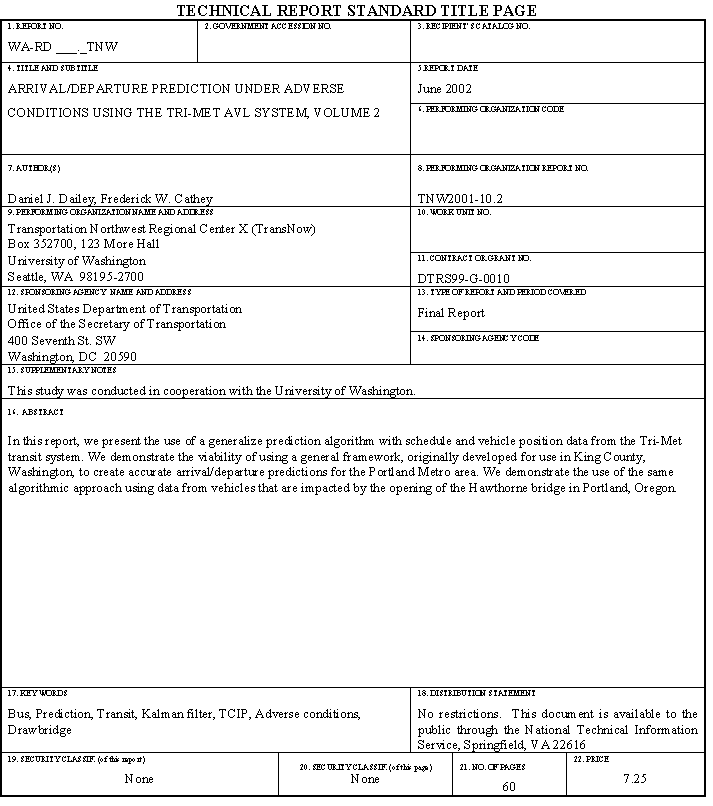 1. Cathey, F.W. and D.J. Dailey, “A Prescription for Transit Arrival/Departure Prediction Using Automatic Vehicle Location Data,” Transportation Research C, to appear 2002.