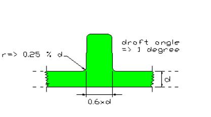 · Ribs located on one side of the part may be seen on the opposite surface. If this is a problem in the design, avoid ribs in this area or alternatively reduce the mass of material by reducing the thickness of ribs, thereby minimizing sink marks. Ribs should be drafted with approximately a 1o angle to assist in part extraction. The thickness of the rib should not exceed 0.6 times the wall thickness. A radius between rib and wall reduces stress concentration. A typical rib design is illustrated in Figure 6-2.
