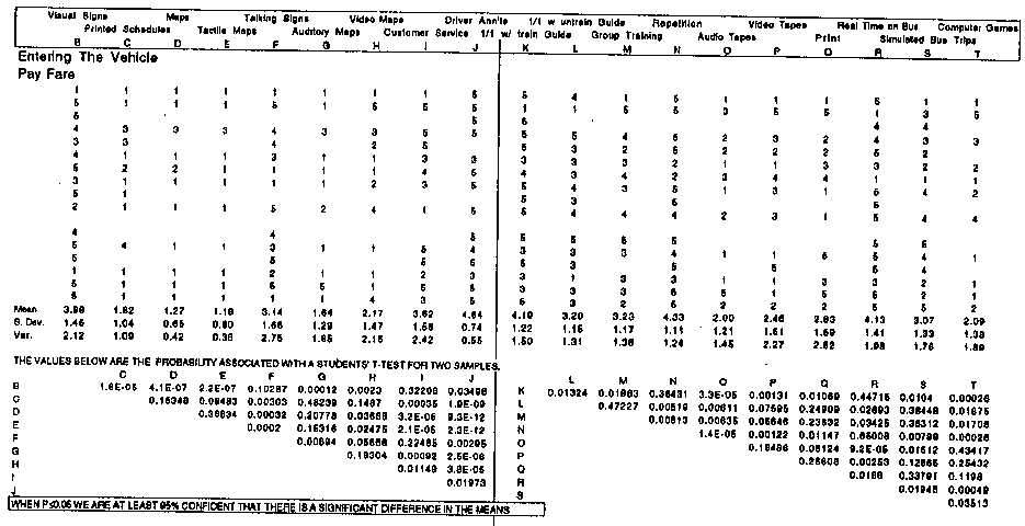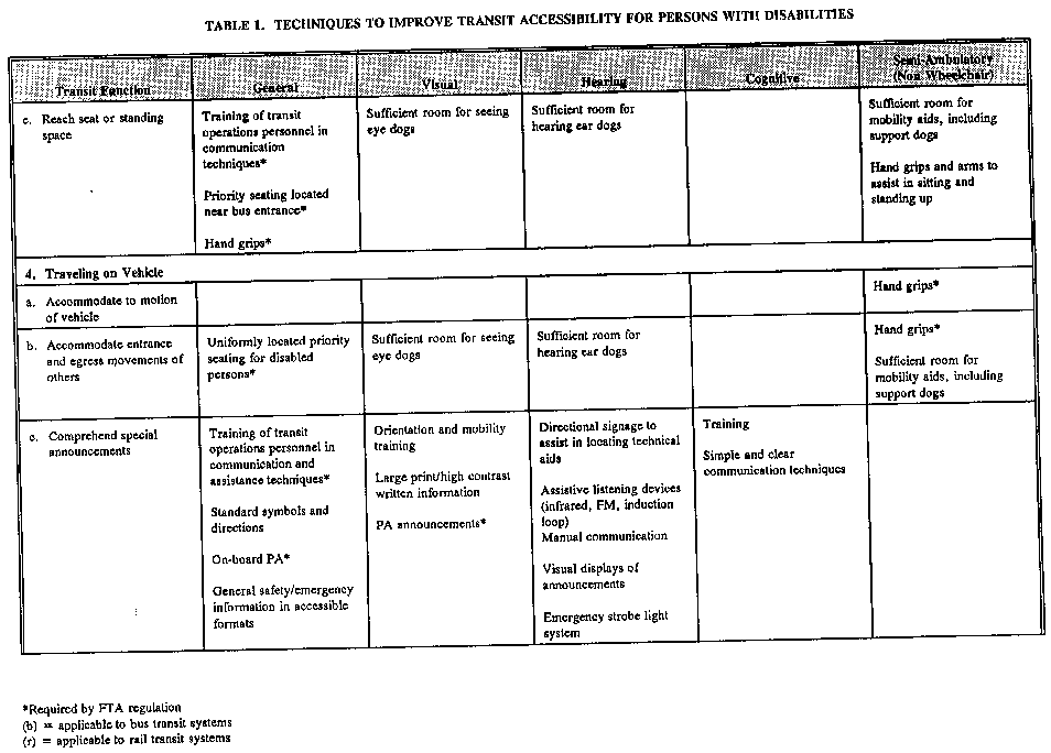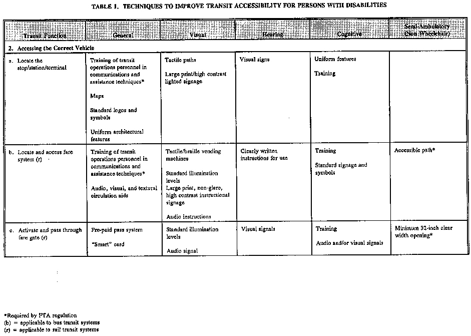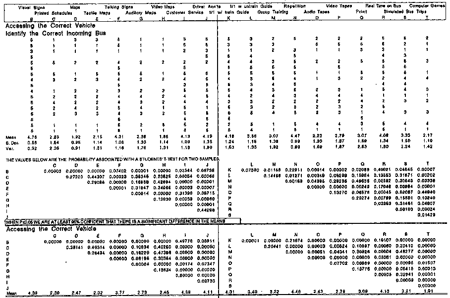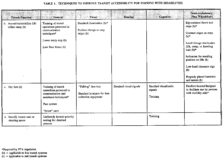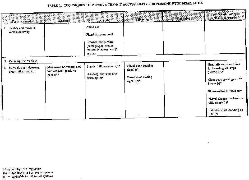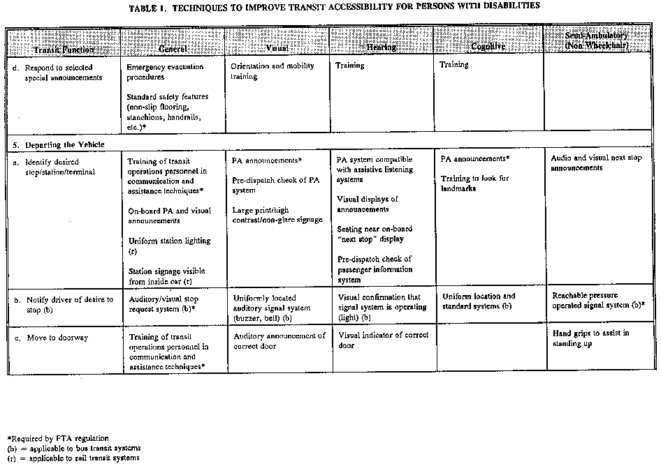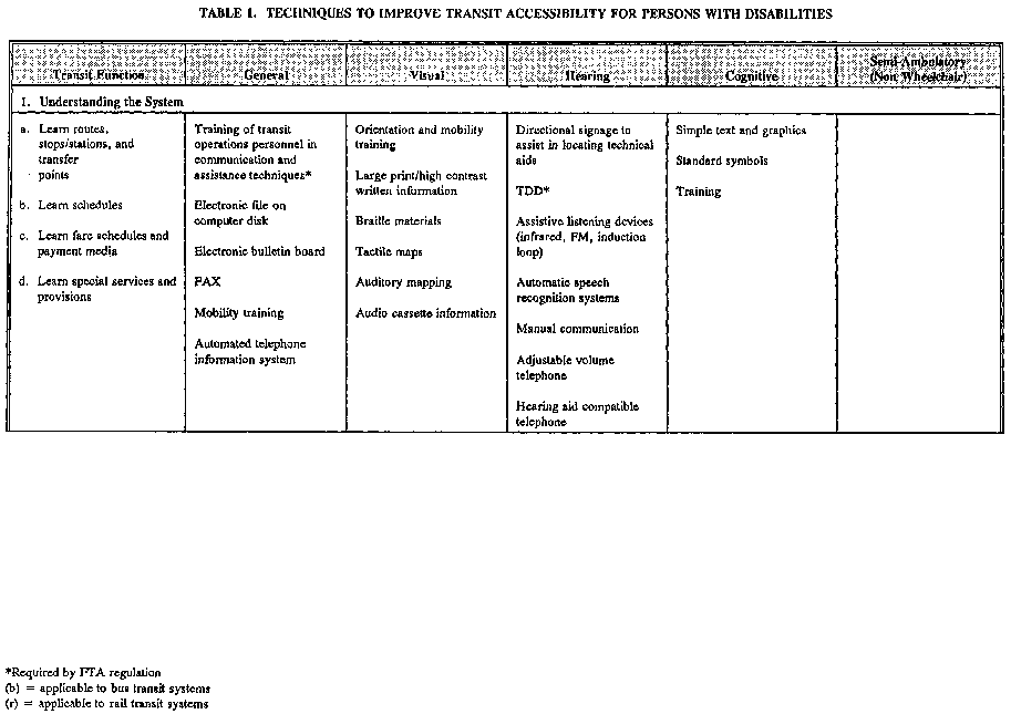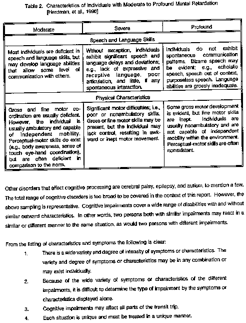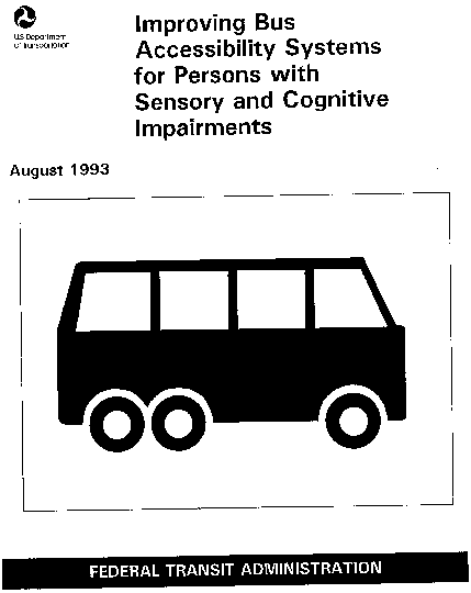 Click HERE for graphic. Improving Bus Accessibility Systems for Persons with Sensory and Cognitive Impairments Final Report August 1993 Prepared by Katharine M. Hunter-Zaworski and Martha Hron Transportation Research Institute Oregon State University Corvallis, Oregon 97331 Prepared for University Research and Training Program Office of Technical Assistance Federal Transit Administration Washington, D.C, 20590 Distributed in Cooperation with Technology Sharing Program U.S. Department of Transportation Washington, D.C. 20590 DOT-T-94-04 Click HERE for graphic. TABLE OF CONTENTS Abstract. . . . . . . . . . . . . . . . . . . . . . . . . . . . . . .v Acknowledgements. . . . . . . . . . . . . . . . . . . . . . . . . .vii CHAPTER 1 INTRODUCTION. . . . . . . . . . . . . . . . . . . . . . . .1 Background . . . . . . . . . . . . . . . . . . . . . . . . . . .1 Goals and Objectives . . . . . . . . . . . . . . . . . . . . . .1 Approach . . . . . . . . . . . . . . . . . . . . . . . . . . . .2 Report Organization. . . . . . . . . . . . . . . . . . . . . . .3 CHAPTER 2 DEFINITIONS . . . . . . . . . . . . . . . . . . . . . . . .5 Rider Tasks. . . . . . . . . . . . . . . . . . . . . . . . . . .5 Evaluation of Rider's Transit Needs. . . . . . . . . . . .5 Understanding the System . . . . . . . . . . . . . . . . .6 Accessing the Correct Vehicle. . . . . . . . . . . . . . .6 Entering the Vehicle . . . . . . . . . . . . . . . . . . .6 Travelling on the Vehicle. . . . . . . . . . . . . . . . .7 Departing the Vehicle. . . . . . . . . . . . . . . . . . .7 Deafness and Hearing Impairments . . . . . . . . . . . . . . . .7 Blindness and Visual Impairments . . . . . . . . . . . . . . . .8 Cognitive Impairments. . . . . . . . . . . . . . . . . . . . . .9 Emotional Impairments. . . . . . . . . . . . . . . . . . .9 Learning Disabilities. . . . . . . . . . . . . . . . . . 10 Brain Injury . . . . . . . . . . . . . . . . . . . . . . 11 Mental Retardation . . . . . . . . . . . . . . . . . . . 11 CHAPTER 3 LITERATURE REVIEW . . . . . . . . . . . . . . . . . . . . 13 Deafness and Hearing Impairments . . . . . . . . . . . . . . . 13 Understanding the System . . . . . . . . . . . . . . . . 13 Accessing the Correct Vehicle. . . . . . . . . . . . . . 14 Entering the Vehicle . . . . . . . . . . . . . . . . . . 15 Travelling on the Vehicle. . . . . . . . . . . . . . . . 15 Departing the Vehicle. . . . . . . . . . . . . . . . . . 17 Existing the Station/Terminal. . . . . . . . . . . . . . 17 Staff Training . . . . . . . . . . . . . . . . . . . . . 18 Transit Policy . . . . . . . . . . . . . . . . . . . . . 18 Blindness and Visual Impairment. . . . . . . . . . . . . . . . 19 Understanding the System . . . . . . . . . . . . . . . . 19 Accessing the Correct Vehicle. . . . . . . . . . . . . . 21 Entering the Vehicle . . . . . . . . . . . . . . . . . . 22 Travelling on the Vehicle. . . . . . . . . . . . . . . . 22 Departing the Vehicle. . . . . . . . . . . . . . . . . . 23 Exiting the Station or Terminal. . . . . . . . . . . . . 23 Training the Users . . . . . . . . . . . . . . . . . . . 23 i Training for Transit Agency Personnel. . . . . . . . . . 23 Cognitive Impairments. . . . . . . . . . . . . . . . . . . . . 24 Training . . . . . . . . . . . . . . . . . . . . . . . . 25 Common Issues. . . . . . . . . . . . . . . . . . . . . . . . . 25 Signage. . . . . . . . . . . . . . . . . . . . . . . . . 26 Electronic Fare Collection Systems . . . . . . . . . . . 27 User Training. . . . . . . . . . . . . . . . . . . . . . 27 Training for the Trainers and Transit Personnel. . . . . 32 Transit Policy . . . . . . . . . . . . . . . . . . . . . 35 CHAPTER 4 SIGNAGE INFORMATION . . . . . . . . . . . . . . . . . . . 37 CHAPTER 5 SURVEY AND INTERVIEWS . . . . . . . . . . . . . . . . . . 41 Survey Methods . . . . . . . . . . . . . . . . . . . . . . . . 41 Survey Results . . . . . . . . . . . . . . . . . . . . . . . . 42 Media. . . . . . . . . . . . . . . . . . . . . . . . . . 42 Training Format. . . . . . . . . . . . . . . . . . . . . 45 Interview Methods. . . . . . . . . . . . . . . . . . . . . . . 48 Interview Results. . . . . . . . . . . . . . . . . . . . . . . 48 Evaluation of Rider Transit Needs and Understanding the System . . . . . . . . . . . . . . . . . . . . . . . . . 48 Accessing the Correct Vehicle. . . . . . . . . . . . . . 49 Entering the Vehicle . . . . . . . . . . . . . . . . . . 49 Travelling on the Vehicle. . . . . . . . . . . . . . . . 50 Departing the Vehicle. . . . . . . . . . . . . . . . . . 50 Exiting the Station/Terminal . . . . . . . . . . . . . . 50 User Training. . . . . . . . . . . . . . . . . . . . . . 50 Transit Personnel. . . . . . . . . . . . . . . . . . . . 51 Additional Comments. . . . . . . . . . . . . . . . . . . 51 CHAPTER 6 SUMMARY AND CONCLUSIONS . . . . . . . . . . . . . . . . . 53 Summary. . . . . . . . . . . . . . . . . . . . . . . . . . . . 53 Deafness and Hearing Impairments . . . . . . . . . . . . 53 Blindness and Visually Impaired. . . . . . . . . . . . . 53 Cognitive Impairments. . . . . . . . . . . . . . . . . . 54 Conclusions. . . . . . . . . . . . . . . . . . . . . . . . . . 55 CHAPTER 7 RECOMMENDATIONS . . . . . . . . . . . . . . . . . . . . . 57 Effective Visual Signage . . . . . . . . . . . . . . . . . . . 57 Training for the User. . . . . . . . . . . . . . . . . . . . . 57 Training for Transit Personnel . . . . . . . . . . . . . . . . 58 Reduce Bus Operator Tasks. . . . . . . . . . . . . . . . . . . 58 Use Technology to Reduce Operator Workload . . . . . . . . . . 59 Cooperation Between Training Facility and Transit Agency . . . 59 Training for Trainers. . . . . . . . . . . . . . . . . . . . . 59 Integration of Assistive Technology. . . . . . . . . . . . . . 59 ii BIBLIOGRAHPHY . . . . . . . . . . . . . . . . . . . . . . . . . . . 61 ANNOTATED BIBLIOGRAPHY. . . . . . . . . . . . . . . . . . . . . . . 63 APPENDICES A Battelle Matrix Summary B Survey C Survey Statistics D Interview List iii iv ABSTRACT