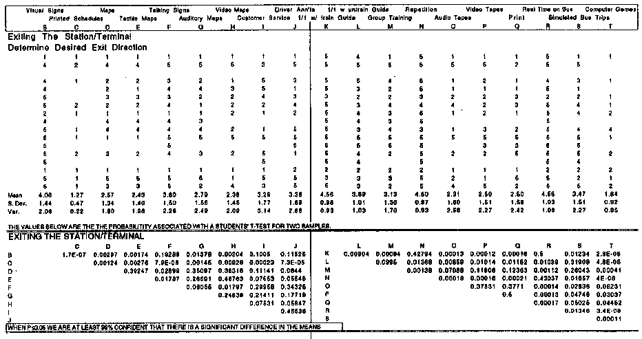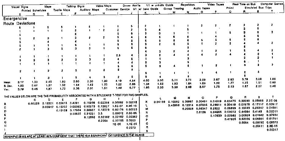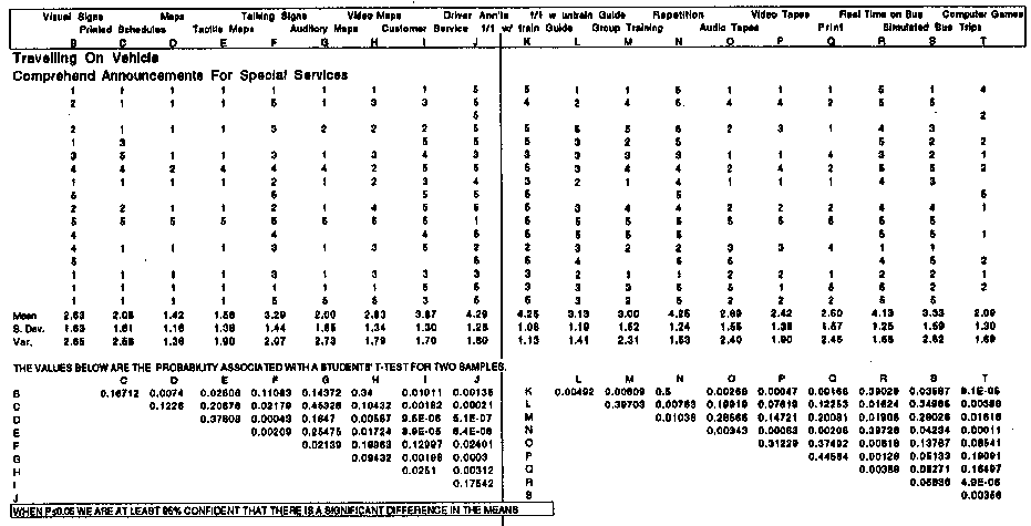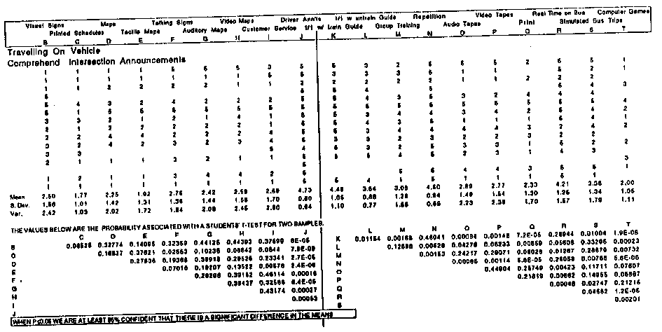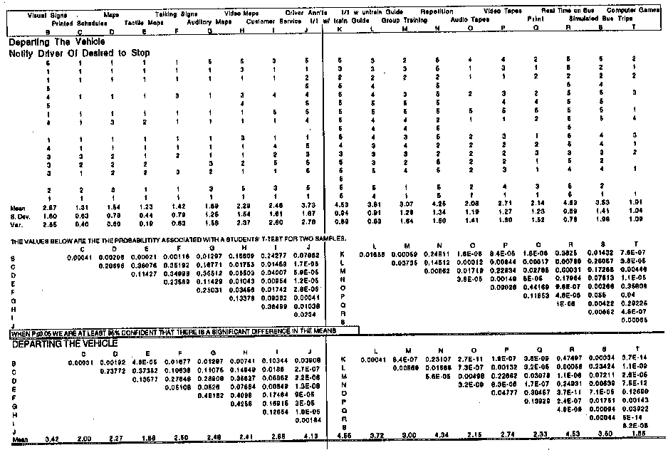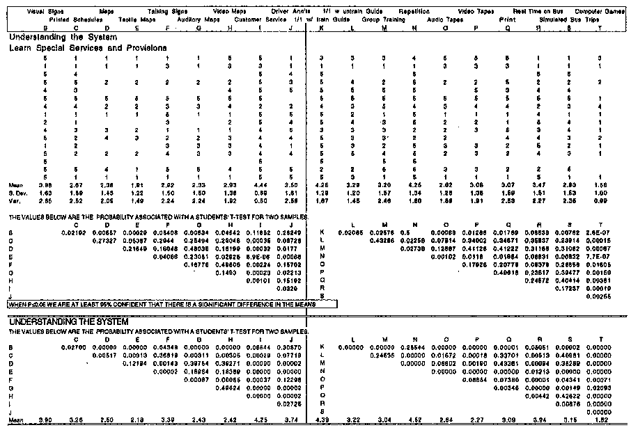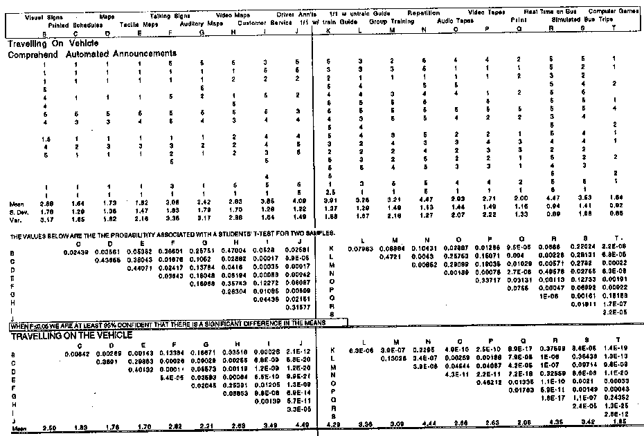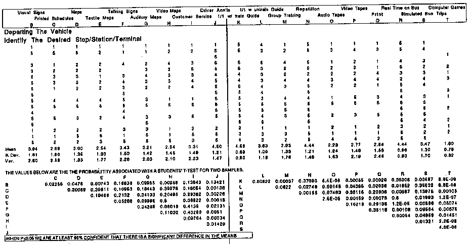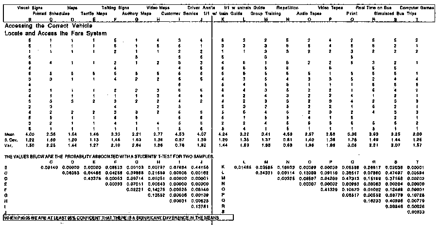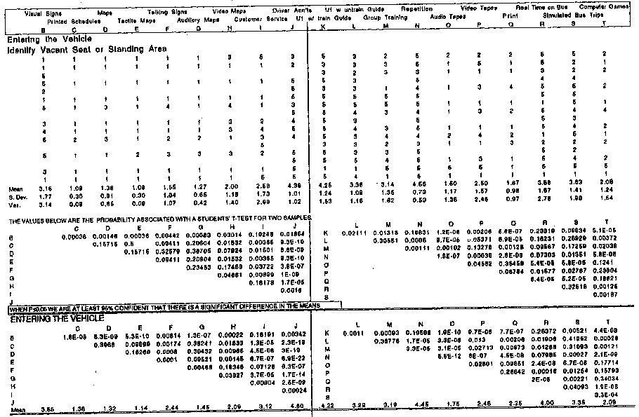 Click HERE for graphic. Improving Bus Accessibility Systems for Persons with Sensory and Cognitive Impairments Final Report August 1993 Prepared by Katharine M. Hunter-Zaworski and Martha Hron Transportation Research Institute Oregon State University Corvallis, Oregon 97331 Prepared for University Research and Training Program Office of Technical Assistance Federal Transit Administration Washington, D.C, 20590 Distributed in Cooperation with Technology Sharing Program U.S. Department of Transportation Washington, D.C. 20590 DOT-T-94-04 Click HERE for graphic. TABLE OF CONTENTS Abstract. . . . . . . . . . . . . . . . . . . . . . . . . . . . . . .v Acknowledgements. . . . . . . . . . . . . . . . . . . . . . . . . .vii CHAPTER 1 INTRODUCTION. . . . . . . . . . . . . . . . . . . . . . . .1 Background . . . . . . . . . . . . . . . . . . . . . . . . . . .1 Goals and Objectives . . . . . . . . . . . . . . . . . . . . . .1 Approach . . . . . . . . . . . . . . . . . . . . . . . . . . . .2 Report Organization. . . . . . . . . . . . . . . . . . . . . . .3 CHAPTER 2 DEFINITIONS . . . . . . . . . . . . . . . . . . . . . . . .5 Rider Tasks. . . . . . . . . . . . . . . . . . . . . . . . . . .5 Evaluation of Rider's Transit Needs. . . . . . . . . . . .5 Understanding the System . . . . . . . . . . . . . . . . .6 Accessing the Correct Vehicle. . . . . . . . . . . . . . .6 Entering the Vehicle . . . . . . . . . . . . . . . . . . .6 Travelling on the Vehicle. . . . . . . . . . . . . . . . .7 Departing the Vehicle. . . . . . . . . . . . . . . . . . .7 Deafness and Hearing Impairments . . . . . . . . . . . . . . . .7 Blindness and Visual Impairments . . . . . . . . . . . . . . . .8 Cognitive Impairments. . . . . . . . . . . . . . . . . . . . . .9 Emotional Impairments. . . . . . . . . . . . . . . . . . .9 Learning Disabilities. . . . . . . . . . . . . . . . . . 10 Brain Injury . . . . . . . . . . . . . . . . . . . . . . 11 Mental Retardation . . . . . . . . . . . . . . . . . . . 11 CHAPTER 3 LITERATURE REVIEW . . . . . . . . . . . . . . . . . . . . 13 Deafness and Hearing Impairments . . . . . . . . . . . . . . . 13 Understanding the System . . . . . . . . . . . . . . . . 13 Accessing the Correct Vehicle. . . . . . . . . . . . . . 14 Entering the Vehicle . . . . . . . . . . . . . . . . . . 15 Travelling on the Vehicle. . . . . . . . . . . . . . . . 15 Departing the Vehicle. . . . . . . . . . . . . . . . . . 17 Existing the Station/Terminal. . . . . . . . . . . . . . 17 Staff Training . . . . . . . . . . . . . . . . . . . . . 18 Transit Policy . . . . . . . . . . . . . . . . . . . . . 18 Blindness and Visual Impairment. . . . . . . . . . . . . . . . 19 Understanding the System . . . . . . . . . . . . . . . . 19 Accessing the Correct Vehicle. . . . . . . . . . . . . . 21 Entering the Vehicle . . . . . . . . . . . . . . . . . . 22 Travelling on the Vehicle. . . . . . . . . . . . . . . . 22 Departing the Vehicle. . . . . . . . . . . . . . . . . . 23 Exiting the Station or Terminal. . . . . . . . . . . . . 23 Training the Users . . . . . . . . . . . . . . . . . . . 23 i Training for Transit Agency Personnel. . . . . . . . . . 23 Cognitive Impairments. . . . . . . . . . . . . . . . . . . . . 24 Training . . . . . . . . . . . . . . . . . . . . . . . . 25 Common Issues. . . . . . . . . . . . . . . . . . . . . . . . . 25 Signage. . . . . . . . . . . . . . . . . . . . . . . . . 26 Electronic Fare Collection Systems . . . . . . . . . . . 27 User Training. . . . . . . . . . . . . . . . . . . . . . 27 Training for the Trainers and Transit Personnel. . . . . 32 Transit Policy . . . . . . . . . . . . . . . . . . . . . 35 CHAPTER 4 SIGNAGE INFORMATION . . . . . . . . . . . . . . . . . . . 37 CHAPTER 5 SURVEY AND INTERVIEWS . . . . . . . . . . . . . . . . . . 41 Survey Methods . . . . . . . . . . . . . . . . . . . . . . . . 41 Survey Results . . . . . . . . . . . . . . . . . . . . . . . . 42 Media. . . . . . . . . . . . . . . . . . . . . . . . . . 42 Training Format. . . . . . . . . . . . . . . . . . . . . 45 Interview Methods. . . . . . . . . . . . . . . . . . . . . . . 48 Interview Results. . . . . . . . . . . . . . . . . . . . . . . 48 Evaluation of Rider Transit Needs and Understanding the System . . . . . . . . . . . . . . . . . . . . . . . . . 48 Accessing the Correct Vehicle. . . . . . . . . . . . . . 49 Entering the Vehicle . . . . . . . . . . . . . . . . . . 49 Travelling on the Vehicle. . . . . . . . . . . . . . . . 50 Departing the Vehicle. . . . . . . . . . . . . . . . . . 50 Exiting the Station/Terminal . . . . . . . . . . . . . . 50 User Training. . . . . . . . . . . . . . . . . . . . . . 50 Transit Personnel. . . . . . . . . . . . . . . . . . . . 51 Additional Comments. . . . . . . . . . . . . . . . . . . 51 CHAPTER 6 SUMMARY AND CONCLUSIONS . . . . . . . . . . . . . . . . . 53 Summary. . . . . . . . . . . . . . . . . . . . . . . . . . . . 53 Deafness and Hearing Impairments . . . . . . . . . . . . 53 Blindness and Visually Impaired. . . . . . . . . . . . . 53 Cognitive Impairments. . . . . . . . . . . . . . . . . . 54 Conclusions. . . . . . . . . . . . . . . . . . . . . . . . . . 55 CHAPTER 7 RECOMMENDATIONS . . . . . . . . . . . . . . . . . . . . . 57 Effective Visual Signage . . . . . . . . . . . . . . . . . . . 57 Training for the User. . . . . . . . . . . . . . . . . . . . . 57 Training for Transit Personnel . . . . . . . . . . . . . . . . 58 Reduce Bus Operator Tasks. . . . . . . . . . . . . . . . . . . 58 Use Technology to Reduce Operator Workload . . . . . . . . . . 59 Cooperation Between Training Facility and Transit Agency . . . 59 Training for Trainers. . . . . . . . . . . . . . . . . . . . . 59 Integration of Assistive Technology. . . . . . . . . . . . . . 59 ii BIBLIOGRAHPHY . . . . . . . . . . . . . . . . . . . . . . . . . . . 61 ANNOTATED BIBLIOGRAPHY. . . . . . . . . . . . . . . . . . . . . . . 63 APPENDICES A Battelle Matrix Summary B Survey C Survey Statistics D Interview List iii iv ABSTRACT