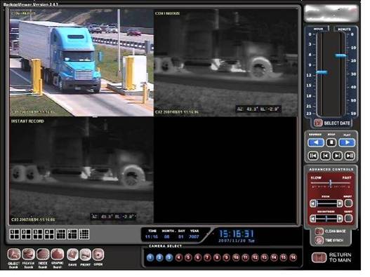 The research team also noted a difficulty in correlating the image in the color (gable-mounted overview) camera viewer and the image in the IR camera viewer, on the three-part composite DVR player screen. As a vehicle approached the ISSES portal, it appeared on the IR viewer several seconds earlier than it appeared on the color monitor. This delay—most likely caused by the operator changing the aim of the IR camera while the overview camera remained stationary, or vice versa—was confusing, since the vehicle shown on the top right (IR) screen was often not the same vehicle visible simultaneously on the top left (color overview) screen (see Figure 21).
