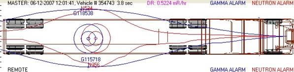 Sample output files from the radiation monitor systems at the Kenton and Laurel sites are shown in Figure 9. While the underlying data are the same, the two JPG images are configured differently. The Kenton images depict a timeline, whereas the Laurel image superimposes a plan view of a generic commercial vehicle. If the monitor detects and alarm condition that exceeds a preset threshold, both formats provide the inspector or analyst with a visual cue as to the location of the emitting source relative to the geometry of the vehicle. The radiation monitor detects both gamma- and neutron-emitting radiation sources, and sounds distinct alarms for each type of source if detected above the threshold.